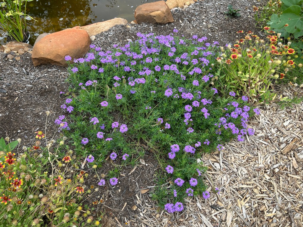 Prairie Verbena (Verbena bipinnatifida) has spread very well beside the pond and is such a vibrant color. In November last year, this plant was in a 4-inch pot.