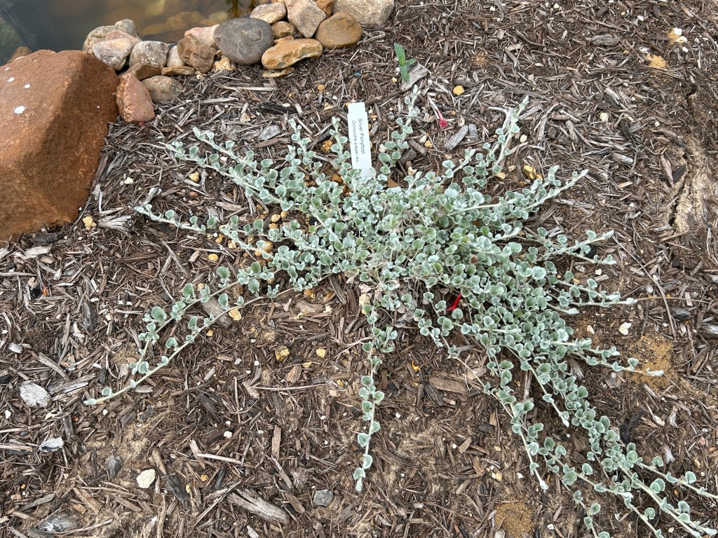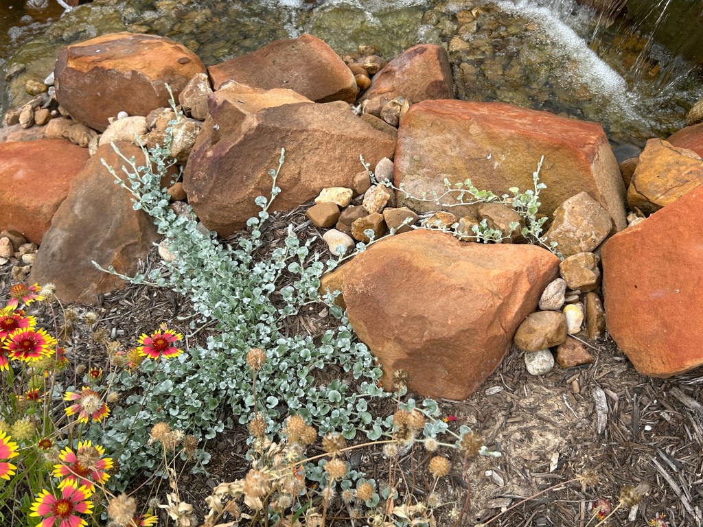 Silver Ponyfoot (Dichondra argentea) has only been in place a few months on the mound behind the pond, but it’s beginning to cover more ground and scramble over rocks nicely.