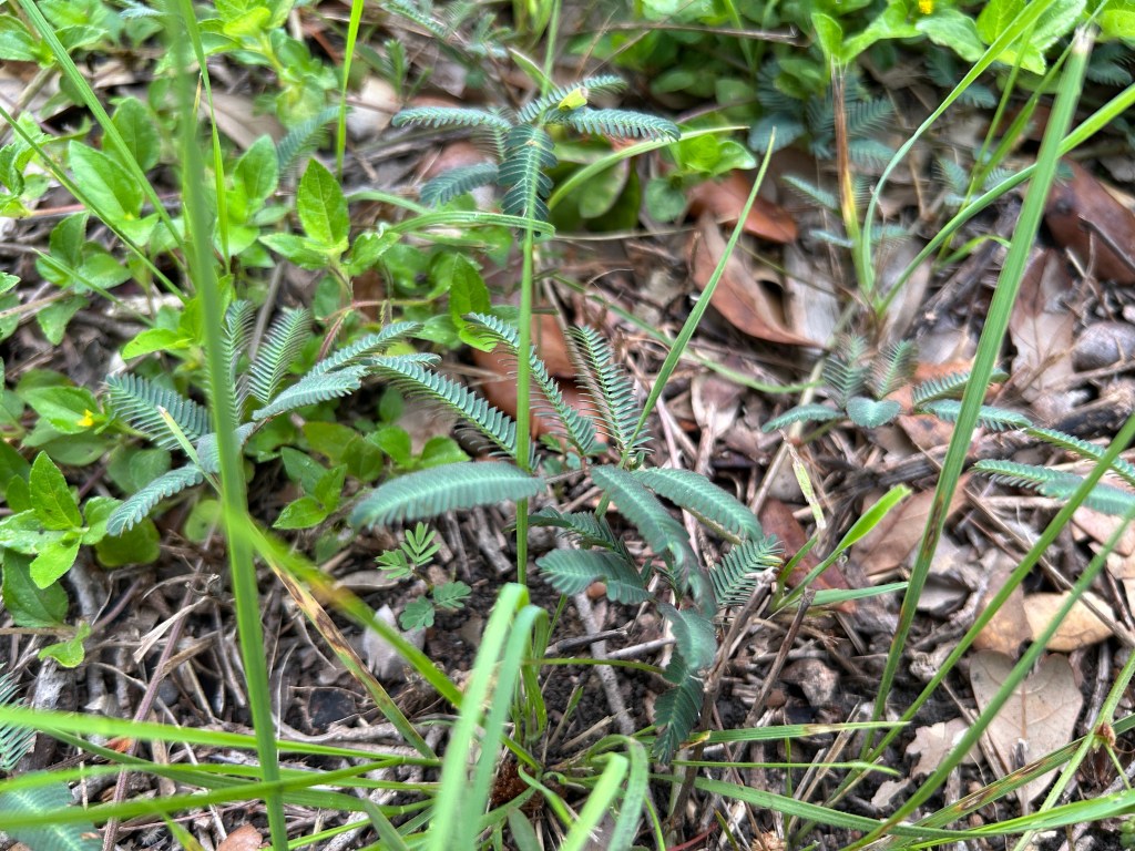 When I was visiting Houston recently I noticed that Powderpuff appeared as a “weed” in some of the lawns nearby, which reminded me that I’d like to have that plant myself. I wasn’t about to dig it out of strangers’ lawns, but I did find some in open land beside a creek nearby. See first photo and the one below (the darker leaves). Powderpuff leaves are sensitive, in that they close up when touched.