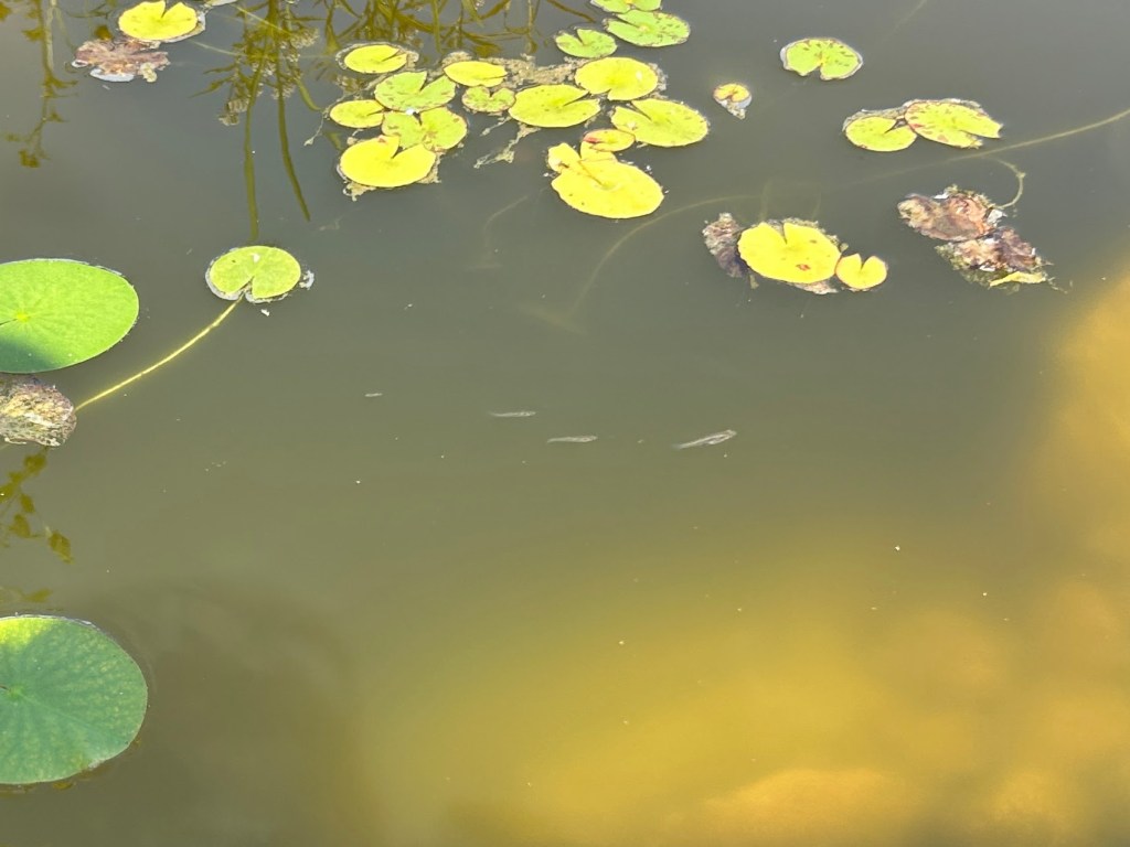 On May 14, 2025, I added 15-ish Western Mosquitofish to the pond. Since then it has been easy to spot them on every visit to the pond, and they seem to be feeding and growing. Before their arrival, the surface of the water contained flecks of particulate matter, but that disappeared within a couple of days and the surface has remained clear. I see some fish traveling around on their own, but more often I see them in small groups of three or so. I feel confident that this population of mosquitofish is doing well, and I think I’m seeing pregnant females. Their diet is supposedly zooplankton, small insects and insect larvae, and detritus material.