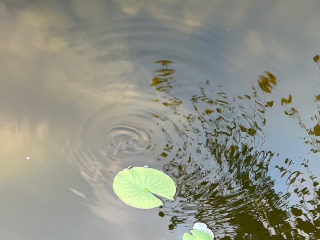 The fish are often easy to spot because when they touch the surface of the water, perhaps to feed, they make ripples, like here. The fish in the photo below are to the left of the water lily leaf.