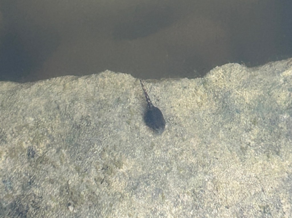 On May 23, 2025, I watched Gulf Coast Toad spawn being produced in the pond. Just three days later, on May 26, I saw some tiny tadpoles. I have seen tadpoles once before, in early spring 2025. In both instances, after a few days the tadpoles progressively (almost) disappeared. In the past month I have seen only one tadpole, and it was still small and relatively undeveloped (photo below taken on June 20, 2025). This tadpole is shorter than any of the fish that I see.