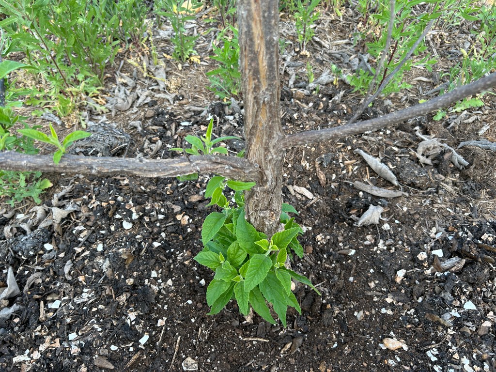 This tree has made a valiant effort to grow back. Now, in June 2025, it has produced many new branches, all originating a foot or less from the ground.