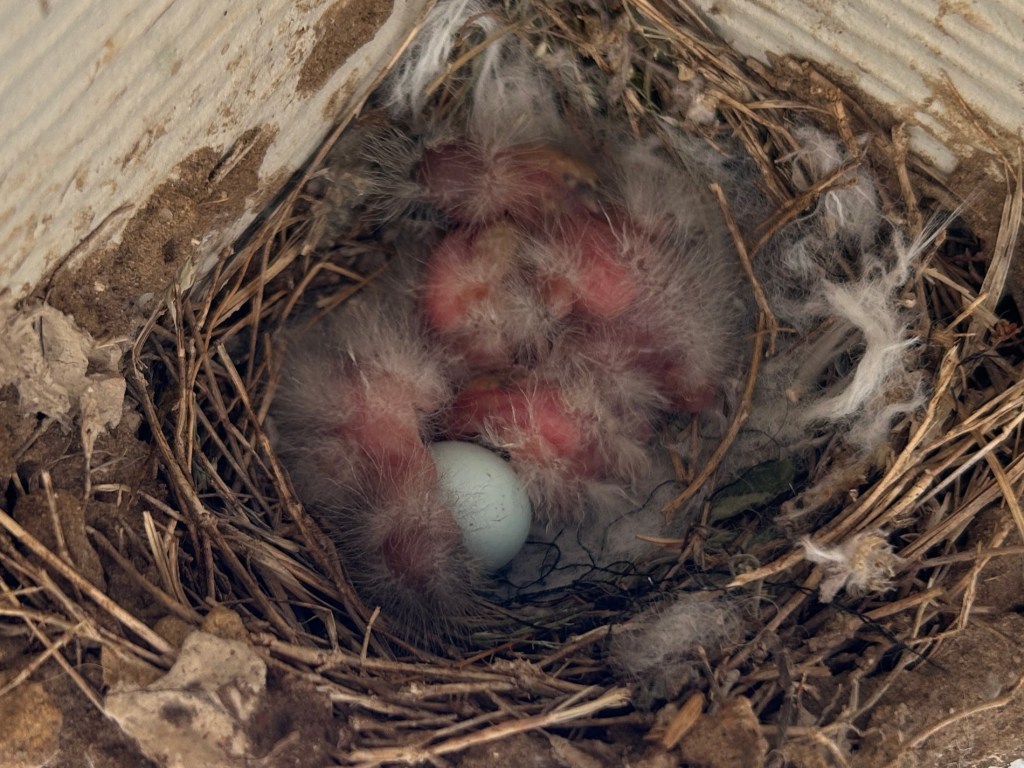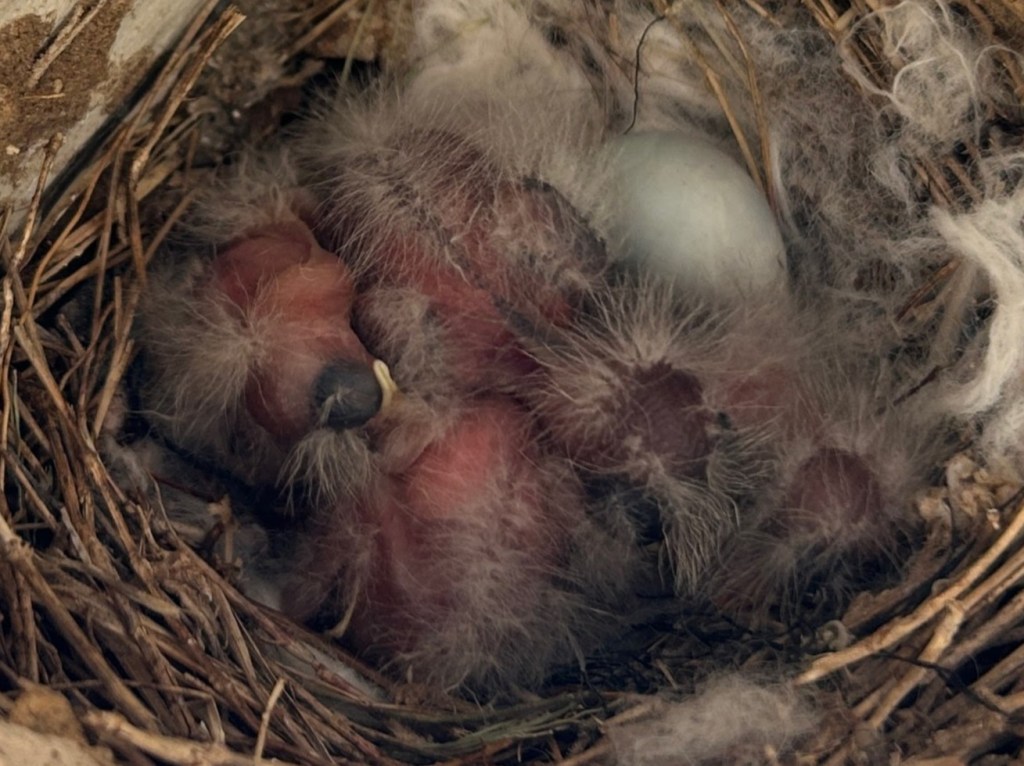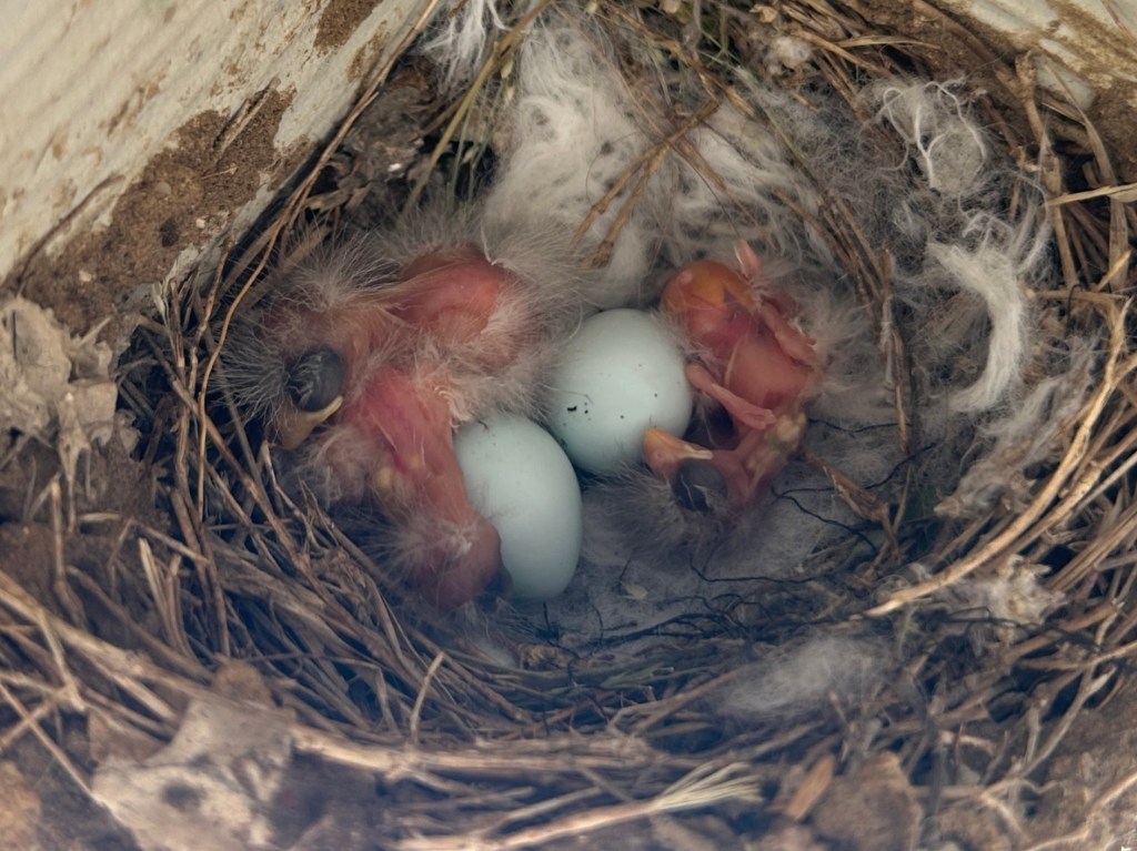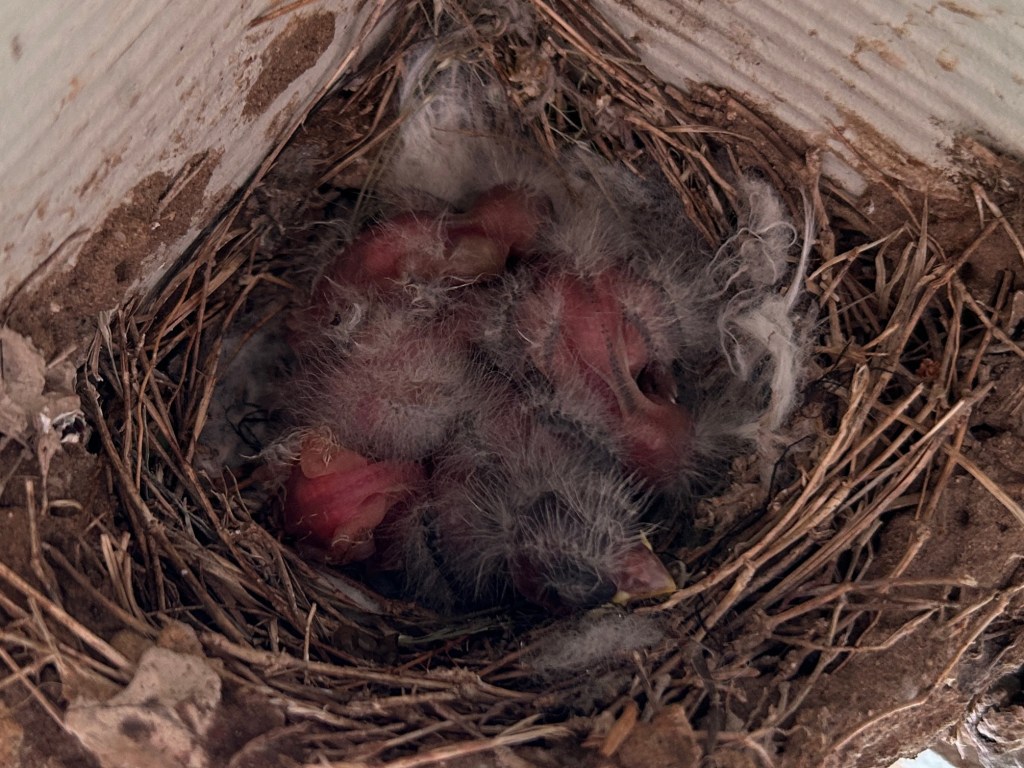 On June 26 I climbed up to get a closer view and a photograph. There were two eggs and three tiny naked chicks. My guess is that the one on the right is the most newly hatched — it seems to be the smallest and most naked.