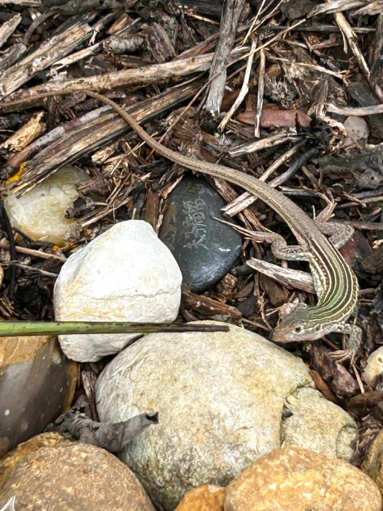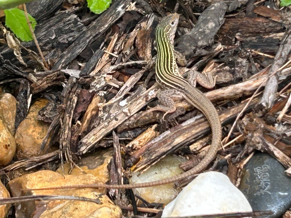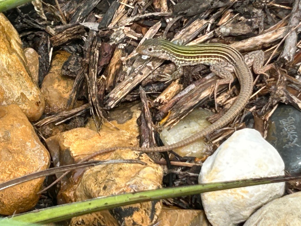 This was the first year (two years since starting a wildlife habitat garden) that I caught sight of a Common Spotted Whiptail (Aspidoscelis gularis) lizard. This particular one may or may not be in the subspecies of Texas Spotted Whiptail (Aspidoscelis gularis gularis). I have had glimpses several times this spring and summer, but these creatures move so fast that I hadn’t been able to get a photograph and proper identification until now.
