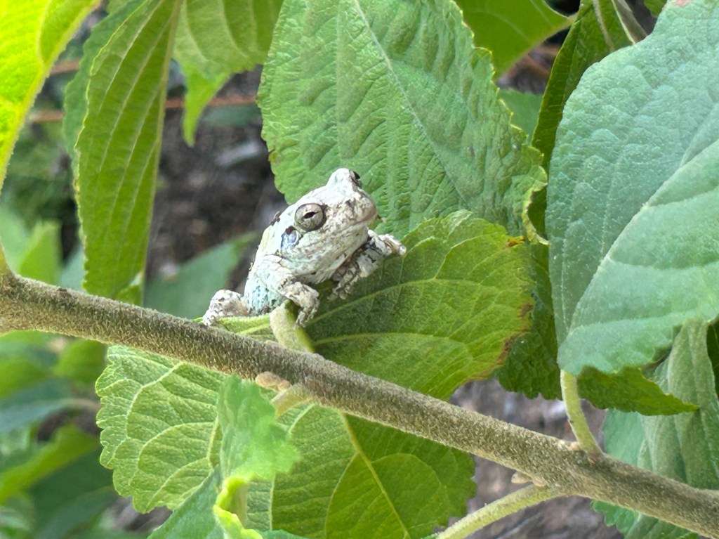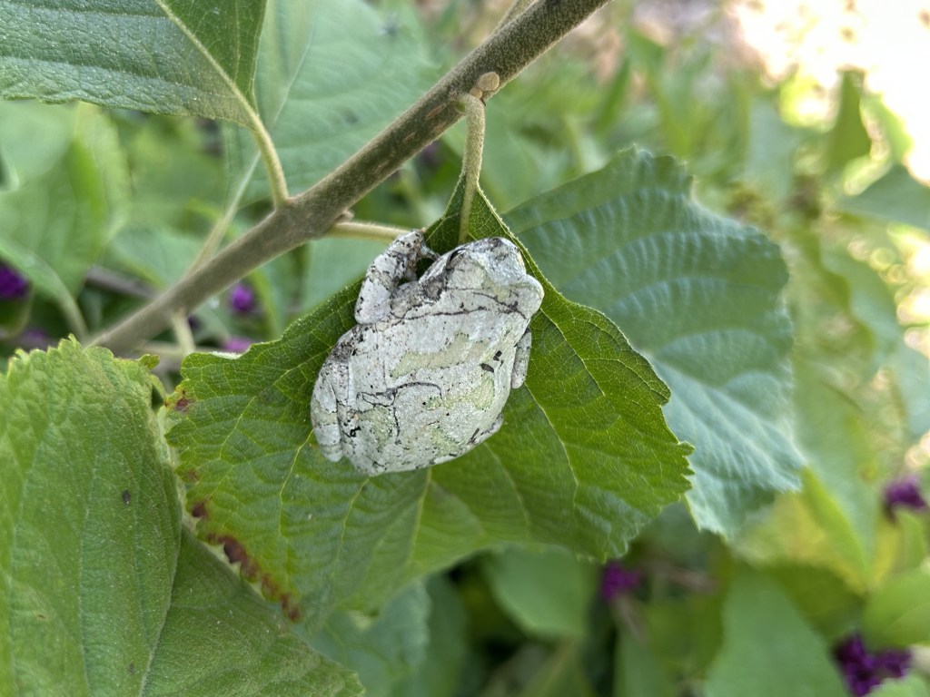 With the help of iNaturalist, I was able to identify this as probably a Gray Treefrog (Dryophytes versicolor). The “versicolor” in the scientific name reflects the fact that these frogs can change color from nearly black to nearly white. They generally live in woodland areas, so I’m very pleased to know that my garden is deemed a suitable habitat for this creature.