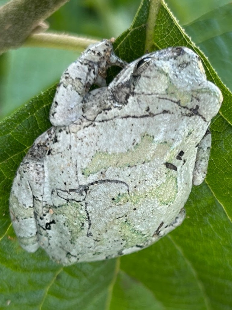 Gray Treefrogs have bright yellow/orange markings on their legs, but they are only visible when they jump. I will admit to gently poking this one with a stick to make it jump — there was indeed a flash of bright orange on the extended legs, but a photo was not possible.