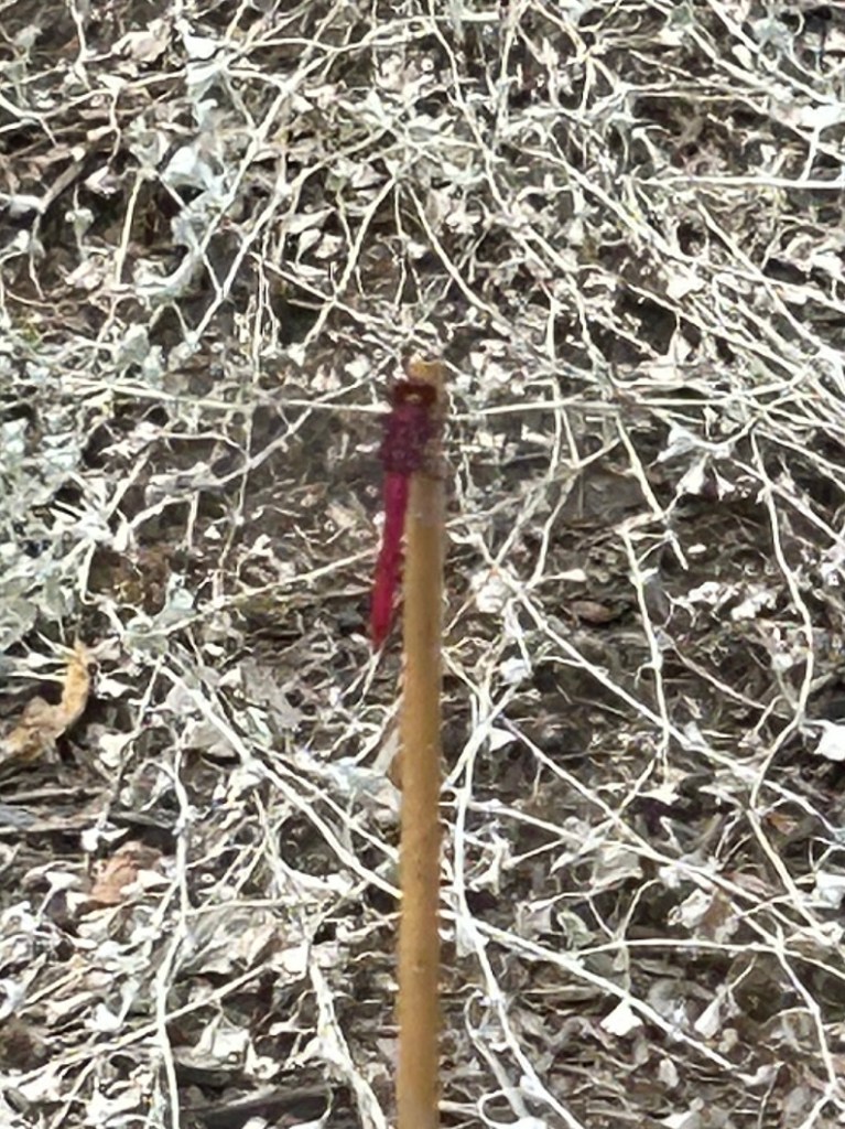 I use bamboo sticks as markers near plants that are new, to remind me to water them while they are getting established. Even though I have plenty of plants here with stiff stems, apparently dragonflies prefer to perch on the bamboo sticks.