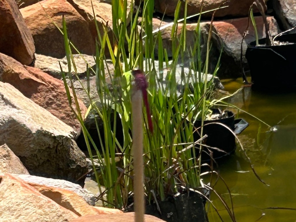 Within hours of planting a Mexican Tulip Poppy near the pond, there was a large pink dragonfly resting on the nearby stick. With the help of iNaturalist I was able to identify this as a male Roseate Skimmer (Orthemis ferruginea). This photograph does not at all indicate how brightly colored he was.
