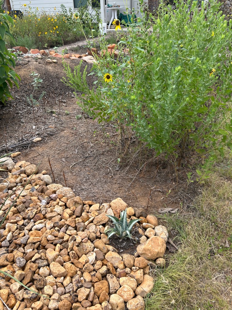 (1) When the pond was installed, the mound that houses the waterfall covered part of the main central pathway that goes from front to back of the garden. Compounding that obstruction was a volunteer Zizotes Milkweed plant that chose to grow right at the narrowest point of the pathway, and that I wanted to keep (establishing native milkweeds is proving difficult, and volunteers are currently welcome). So I widened the pathway.