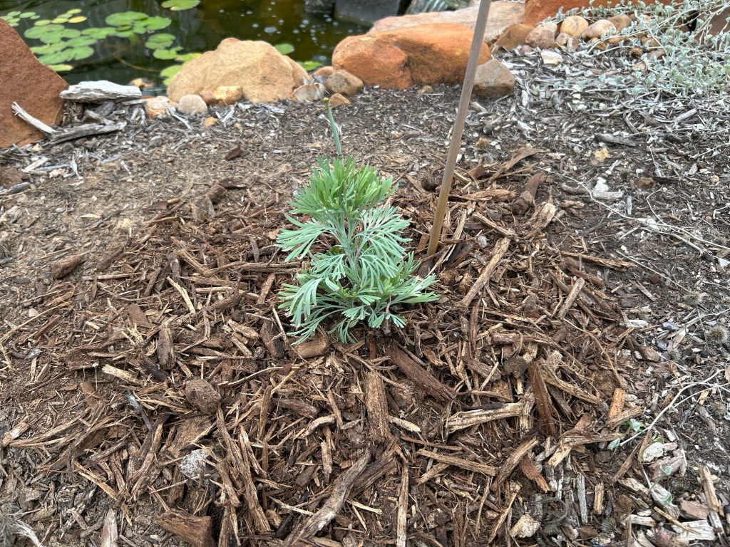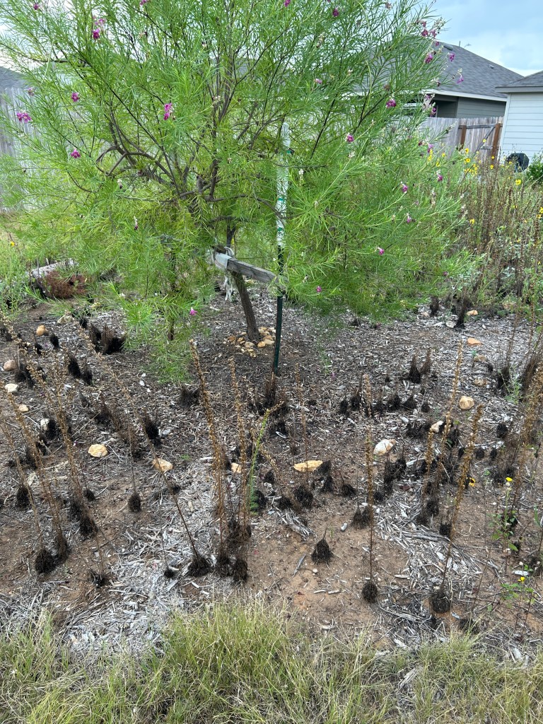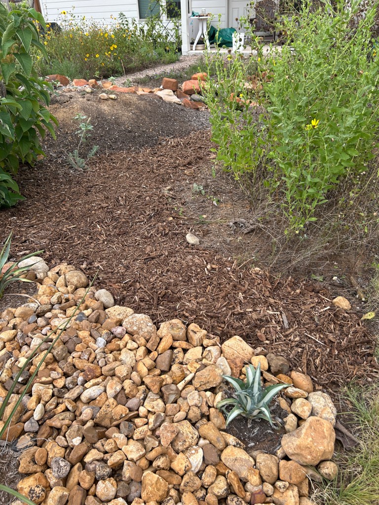 (3) The Desert Willow has also grown a lot and it is so wide now that it is most easily accessed from the grass pathway behind it. (To use my original pathway I have to step over Rock Rose and Standing Cypress that have also grown well.) So I created a new pathway to get to the Desert Willow tree and widened its mulch area a little.