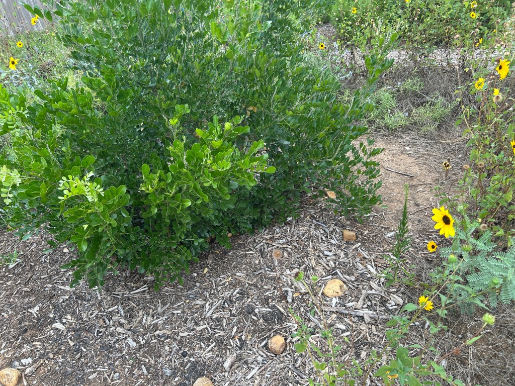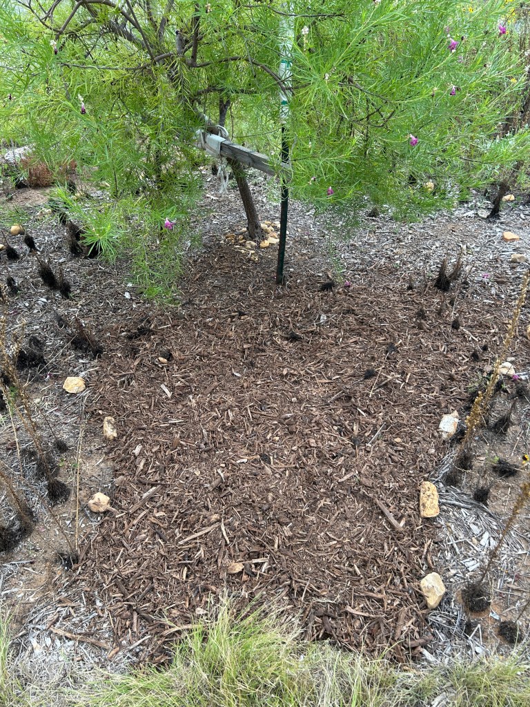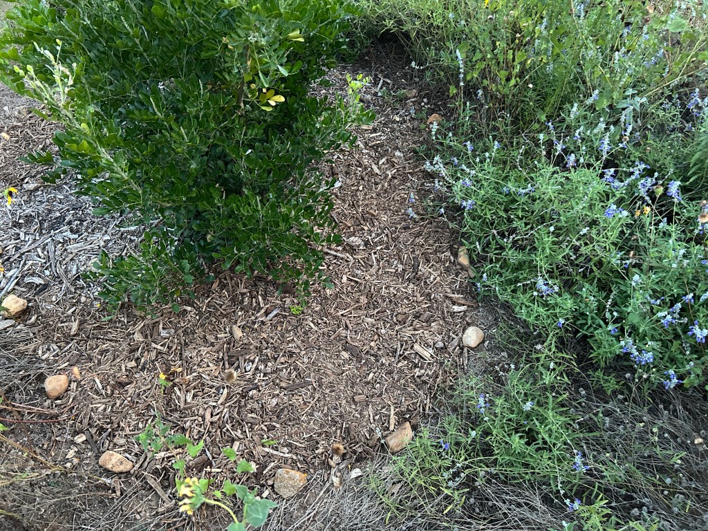 (2) The Texas Mountain Laurel tree has grown significantly in width since I last defined its mulch border. So when I walk round it — which I need to do often to check for Genista Broom Moth caterpillars — I have been walking on bare earth (where annual plants grew earlier this year). I widened the mulched area around this tree.