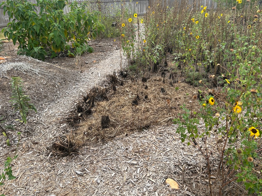 That should be enough mulch for now. Sometime over the winter there will be a major project to bring in enough to add an inch or two to all of the pathways, and a thinner layer in some of the plant beds. Over time the wood breaks down, which is exactly what I want to happen so that the soil progressively gets fed with more organic matter.