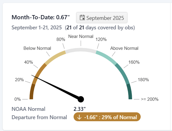 I am hoping for some rain soon. This year’s overall rainfall has been close to normal (although that does include a July major flash flood event where we got 8.64 inches of rain in just four hours that was mostly lost to run-off). This month of September 2025, however, has been very dry so far. Here’s one chart of data from my CoCoRaHS precipitation reporting.