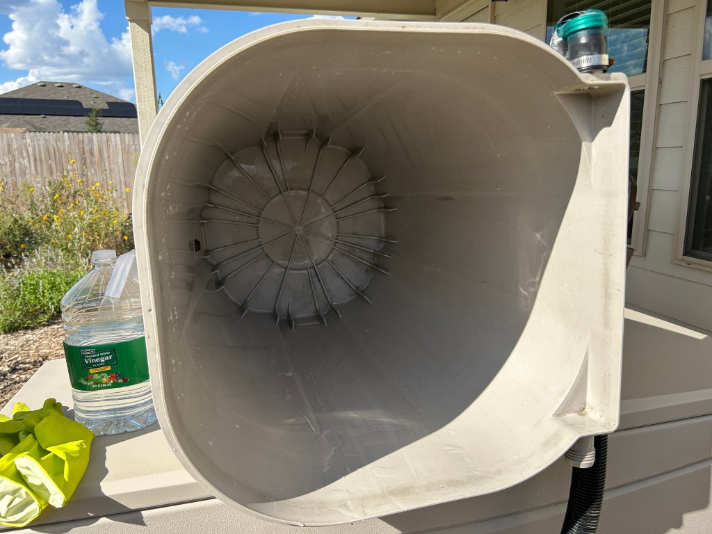 Once the barrels get down to about a quarter full, the flow of water from the spigot is so slow that I usually dredge water out with a bucket. There is quite a bit of dark particulate matter at the bottom, which looks to be primarily the remains of Mosquito Dunk tablets.
