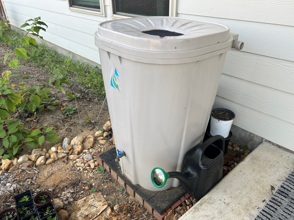 Behind the house there are two 55-gallon rain barrels that capture water from the roof. There are no gutters on this house, so I’ve located the barrels to collect water falling from two places on either side of the patio where there are corners. As a rough estimate, an inch of rainfall will fill one barrel and almost fill the other.