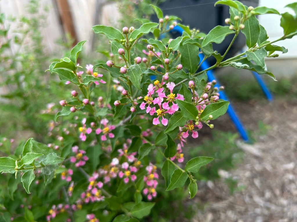 I planted a Barbados Cherry (Malpighia glabra) in 2023. I didn’t realize until I got it home that it was a dwarf variety, so it’s likely to grow in a shrubby form and only reach a height of 4 feet or so.