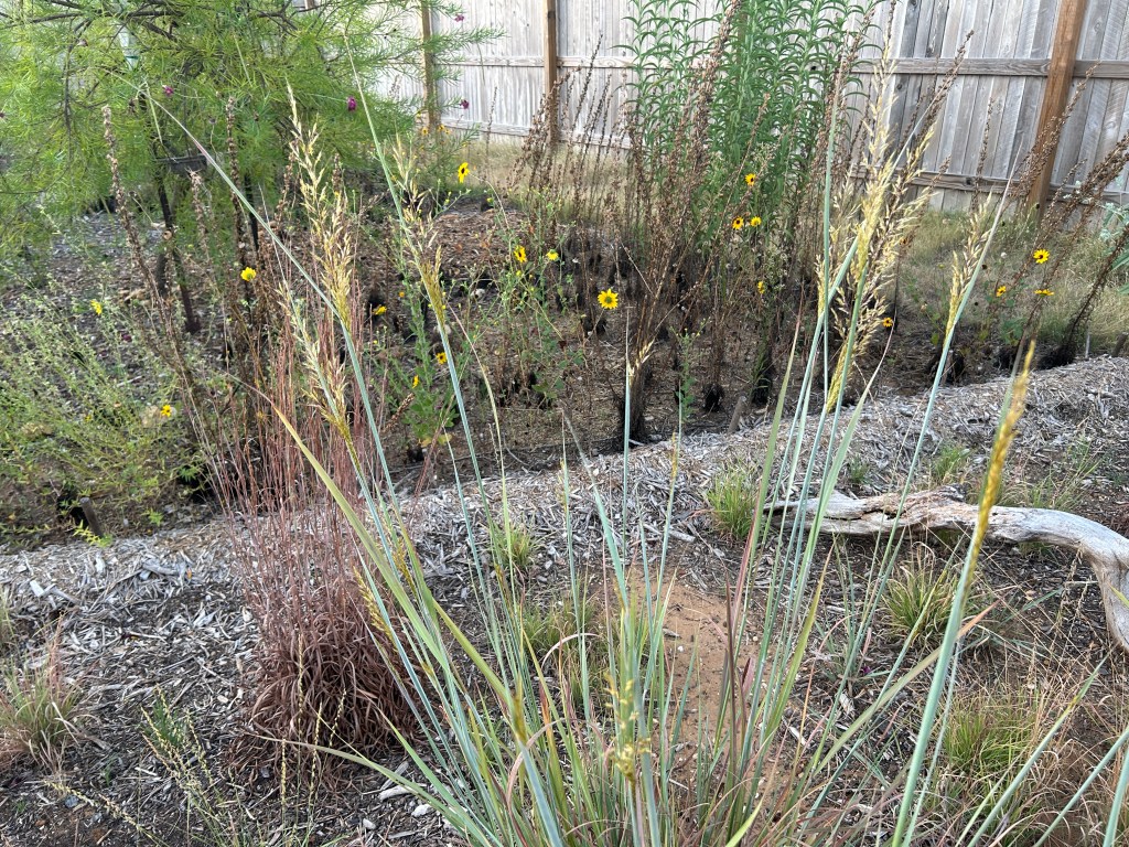 The other grass companions in this area are Little Bluestem (Schizachyrium scoparium), Sideoats Grama (Bouteloua curtipendula), Gulf Muhly (Muhlenbergia capillaris), and Curly Mesquite (Hilaria belangeri). The Curly Mesquite has crept in from the neighboring Thunder Turf area, and over time I plan to remove it once it’s not needed to fill in open spaces.