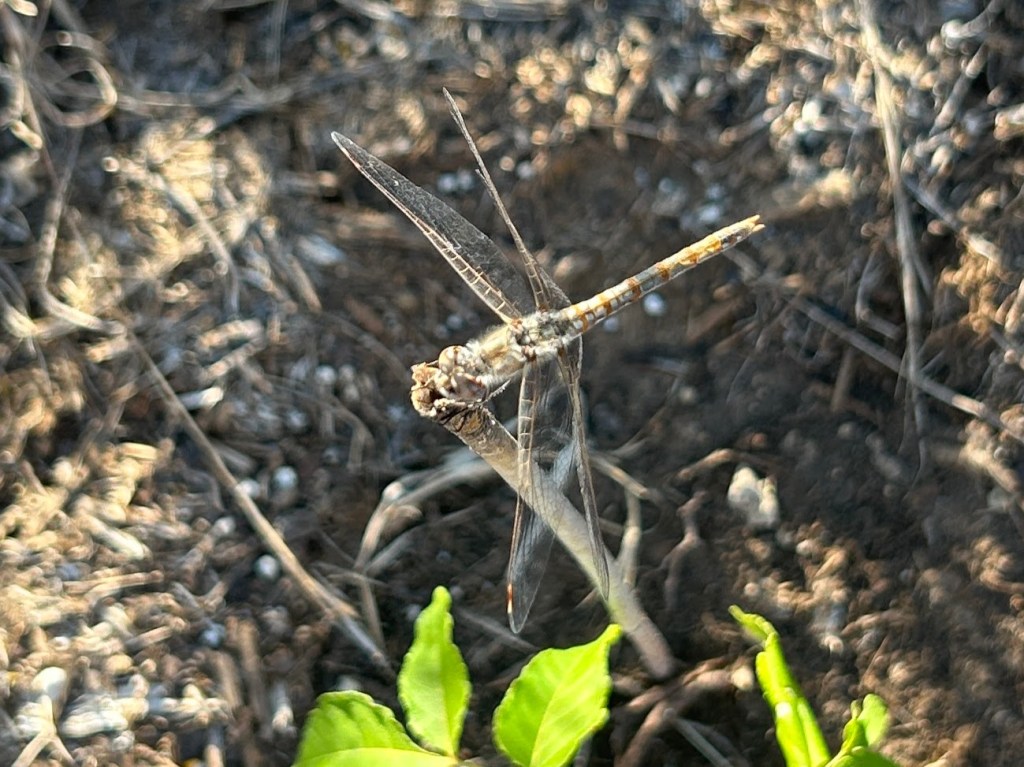 It is rare that I can get close to a dragonfly. However, they do seem to like perching on bamboo poles and I happened to be standing right over my baby Mexican Buckeye tree when a Variegated Meadowhawk (Sympetrum corruptum) landed on the marker stick that is next to the tree.