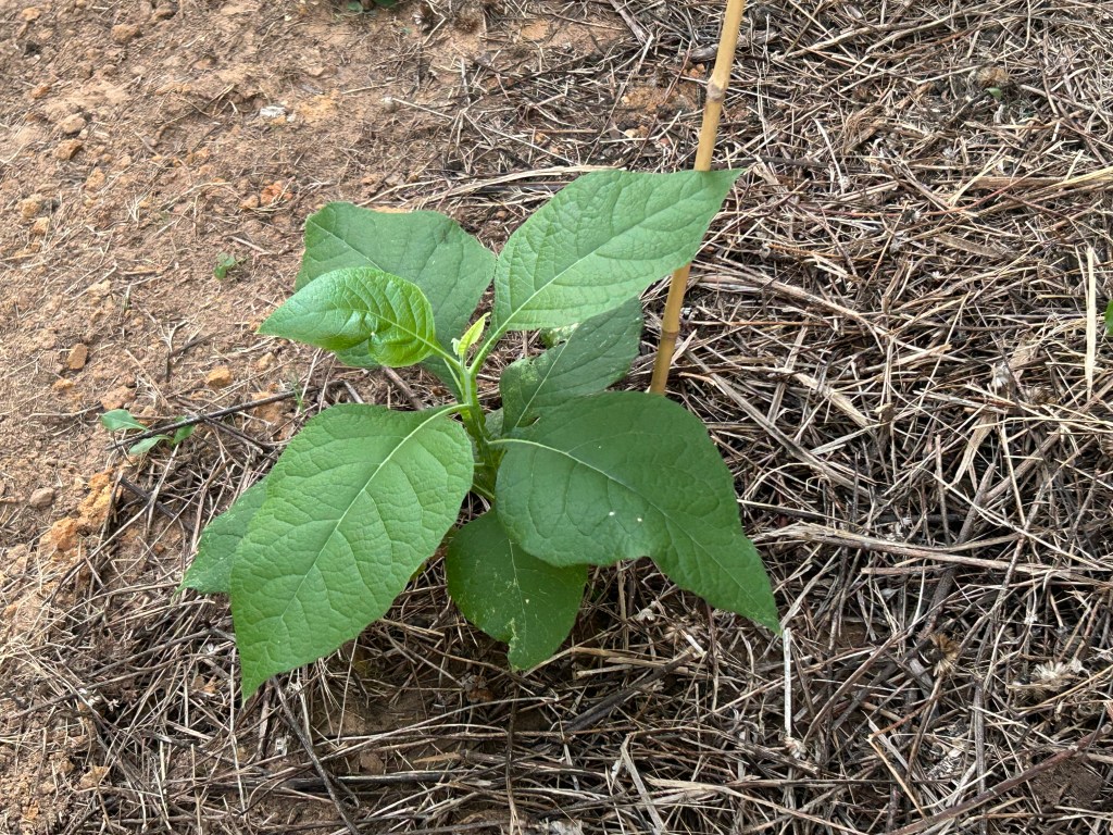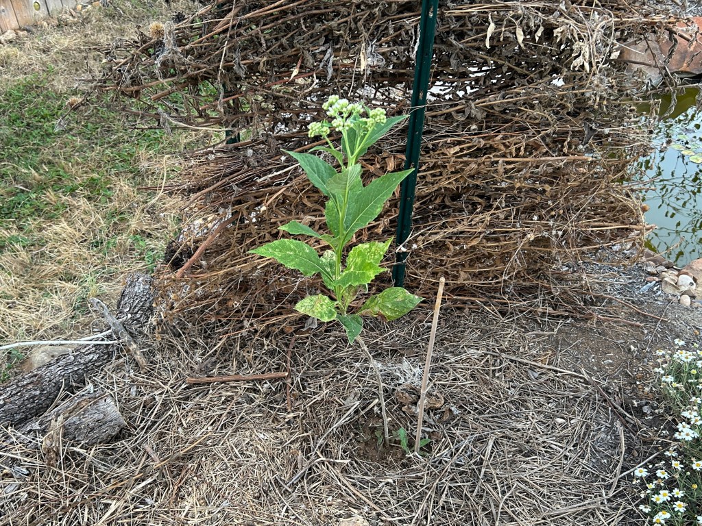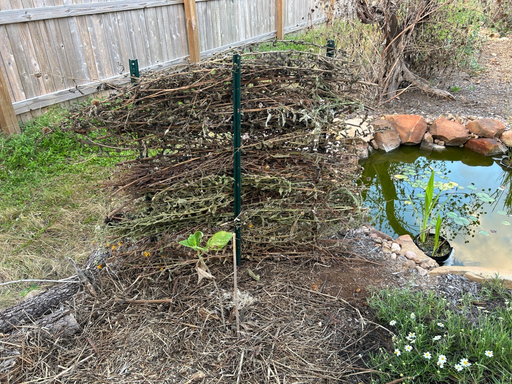 The larger Frostweed is near the pond and has its own “dead hedge” sun screen. This one is already about twice the height of when it was planted and is preparing to bloom! The first photo is from the time of planting; the second photo is recent.