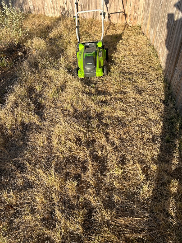 The photo below shows mowing in progress. To the right of the mower is cut, and to the left is yet to be done. I think the last time I mowed this area was about six months ago, so you can see that Thunder Turf doesn’t ever get very tall.