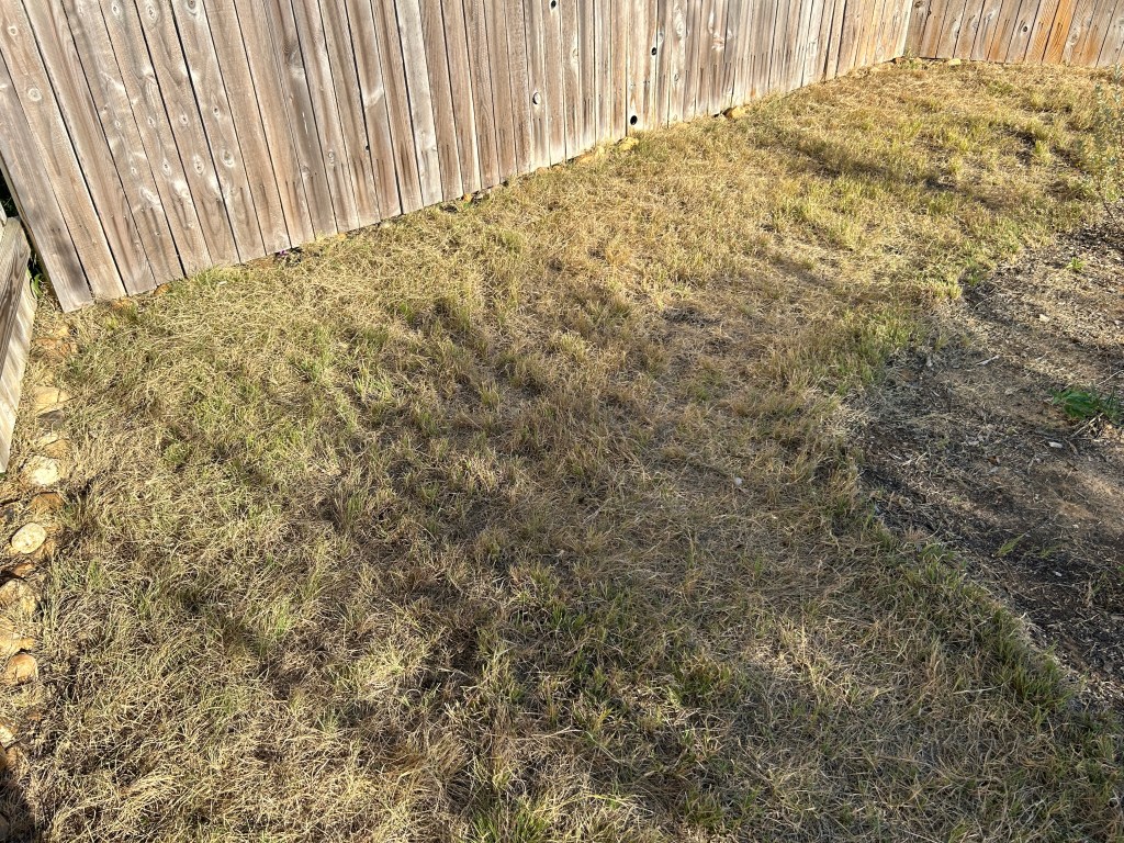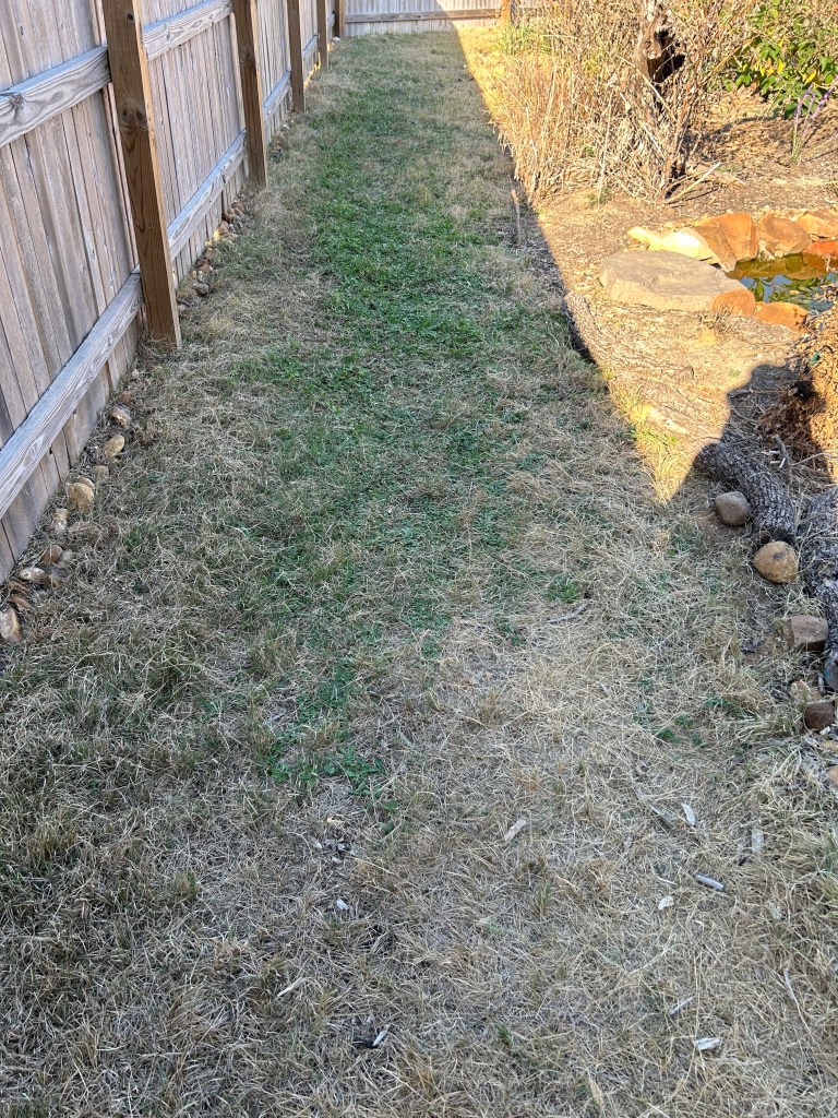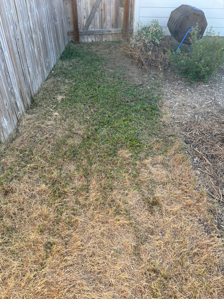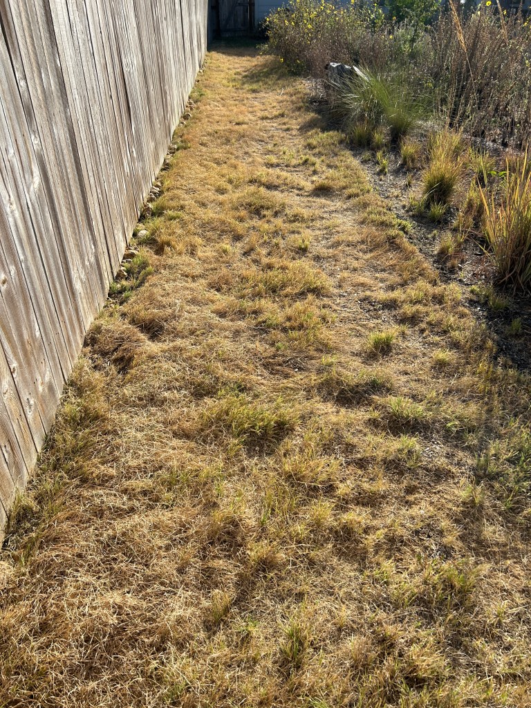 The photos below are a visual tour of the different parts of the Thunder Turf area (after mowing). Because these grasses are around the perimeter of the garden, each section gets a different experience of light, and encroachment from neighbors of water or unwanted plants. Because of the odd shape of our lot, we have six neighbors who share portions of fence with us.