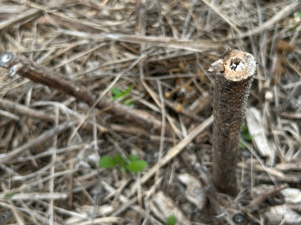 When I cut down annual plants, I leave the roots in the ground to decay. If the stems are thick and hollow, like this sunflower, then I cut them several inches above the ground in case anyone would like to make a home in them.