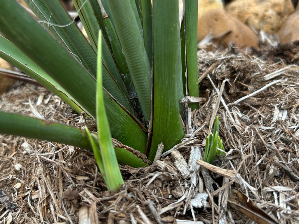 The Yellow Yuccas (Hesperaloe parviflora) that were planted just a year ago have new leaf sprouts, showing that the clumps are growing.