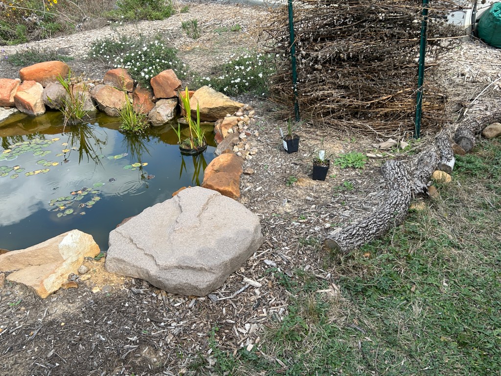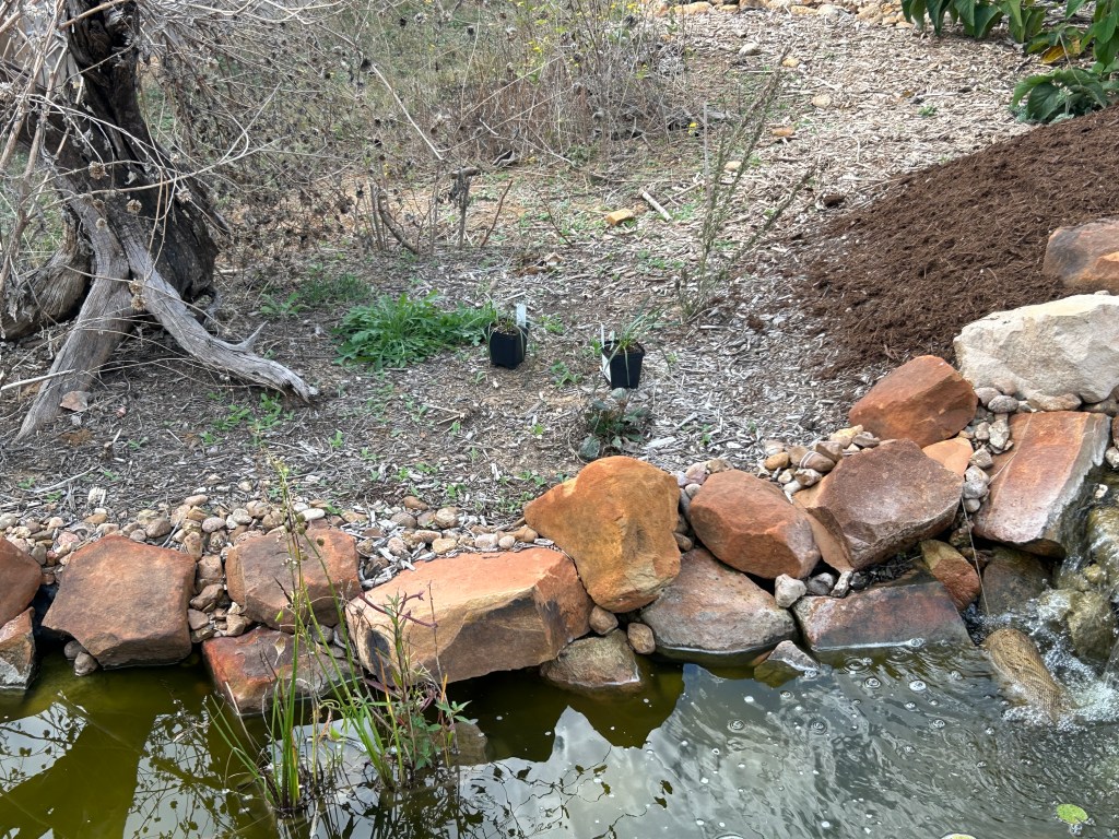 Three are behind the pond, and two are near the pond skimmer. I took the photos below while the new plants were still in their pots to make them easier to spot. In the first picture, the tall plant with multiple stems to the right of the pots is the original Liatris punctata — the blooms have finished but the stems remain.