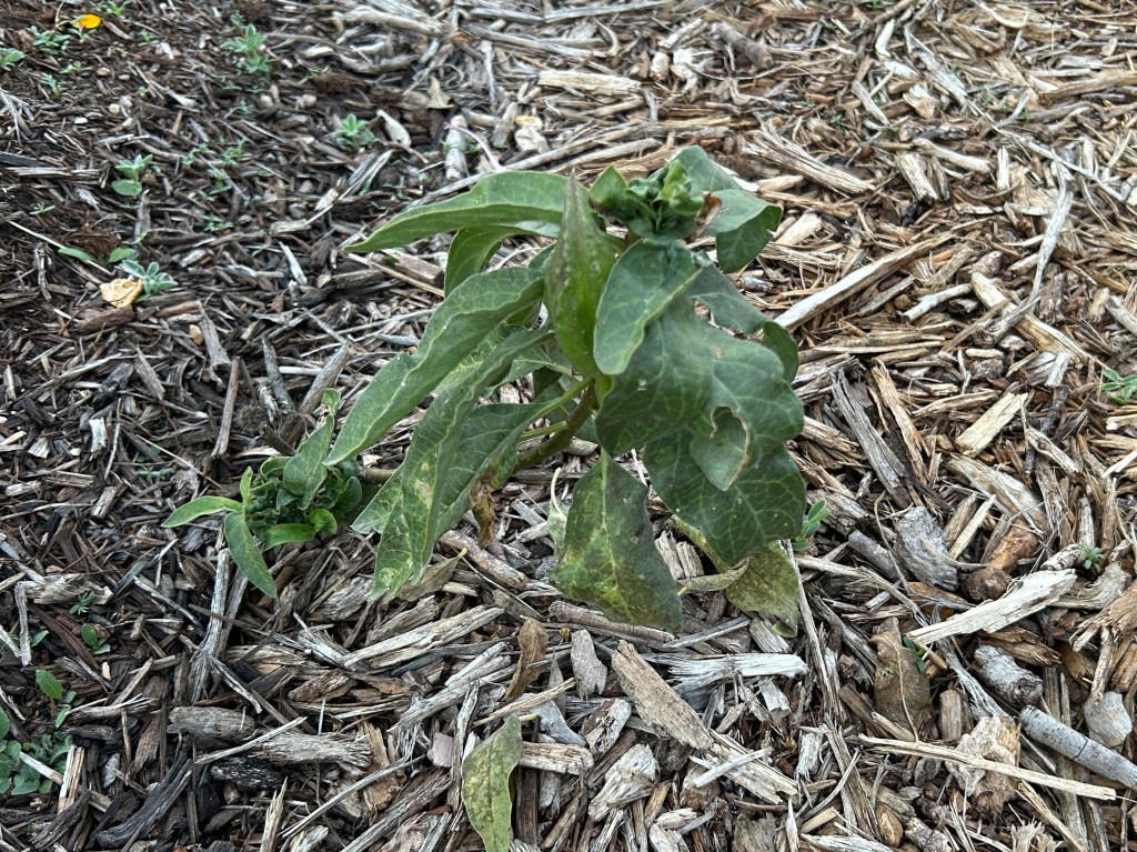 The native milkweed plant that has been most successful here is Zizotes Milkweed (Asclepias oenotheroides). I have volunteers popping up all over the place, including this one in the middle of a pathway (photo taken in November 2025).