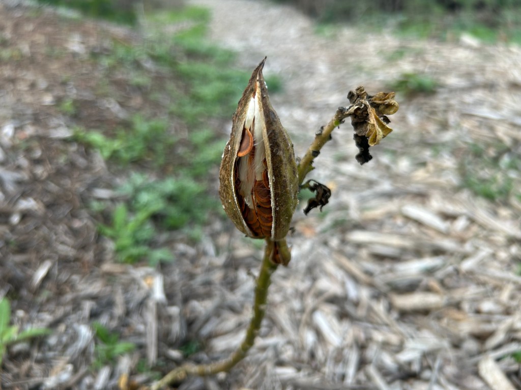 Before I take the seeds to the park next year, I’ll separate them from their hairy parachutes to make it easier to place them in the garden and have them not blow away. The last time I dispersed milkweed seeds taken from a pod I didn’t remove the pappus. It was a windy day and I regretted that omission!