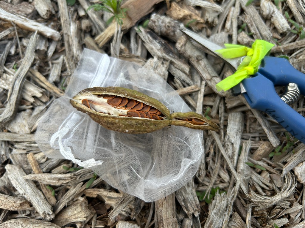 I snipped the seed pod off and placed it in an organza bag. Then I had two choices: I could either plant the seeds immediately in Park West, or I could put the seed pod in the fridge for the winter and plant the seeds in early spring after our annual cut back of the garden following any winter freezes. I chose the latter to reduce the chances of seedlings being accidentally trampled during a work day. Once the garden is set for the spring, then I’ll put out the seed. The time in the cold at home should substitute for natural chill that the seeds would have experienced if left outdoors over the winter.