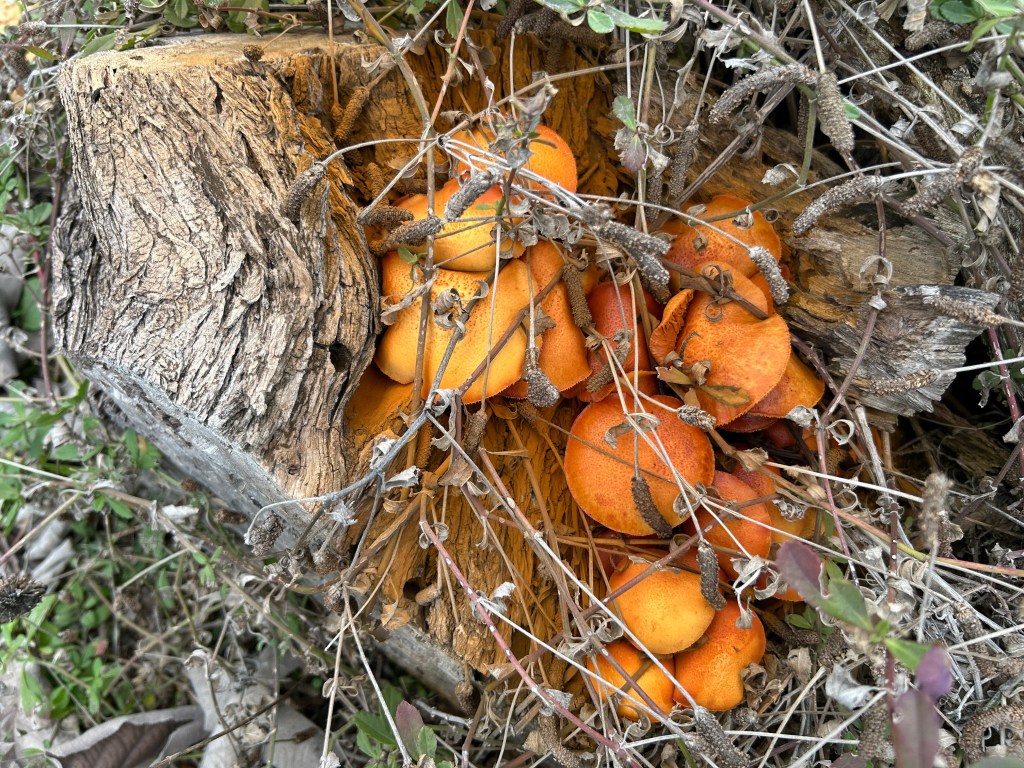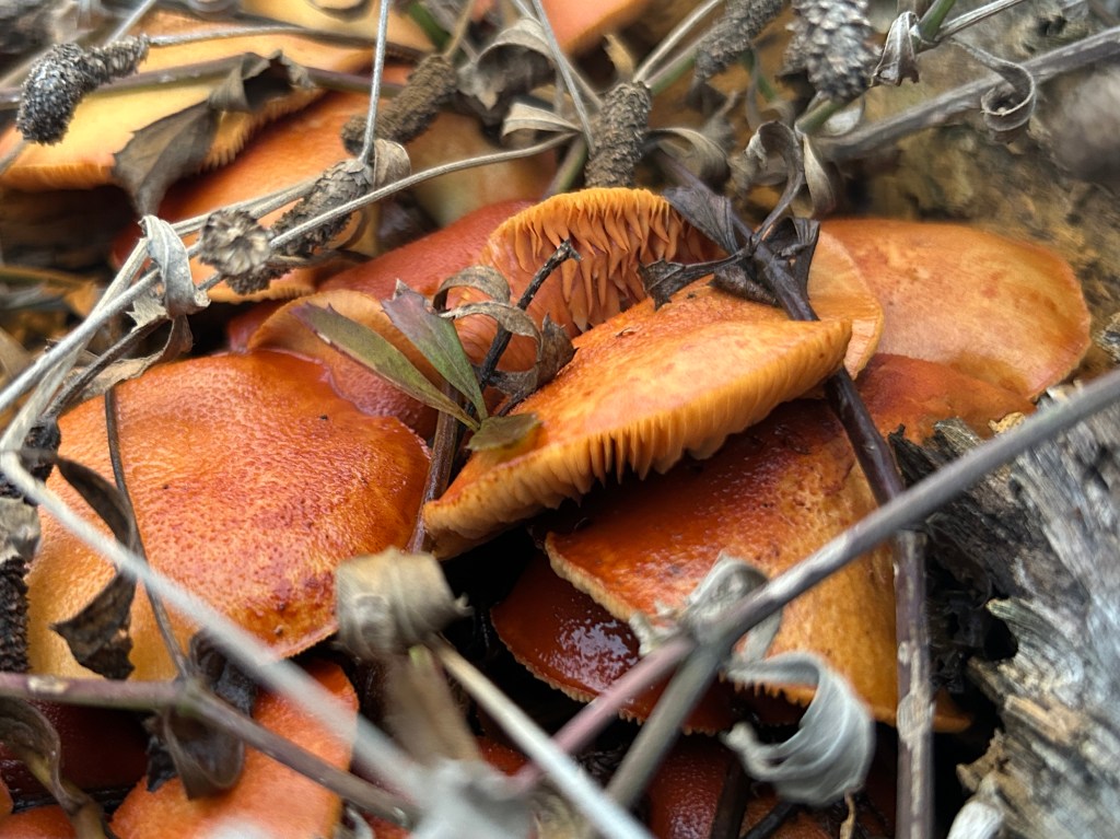As I was walking through the garden recently, I spotted a cluster of bright orange mushrooms on the wood pile. A dusting of orange spores have colored the surrounding wood, which gives the patch an overall orange glow. They were definitely eye-catching, so of course I took photos and tried to identify them.
