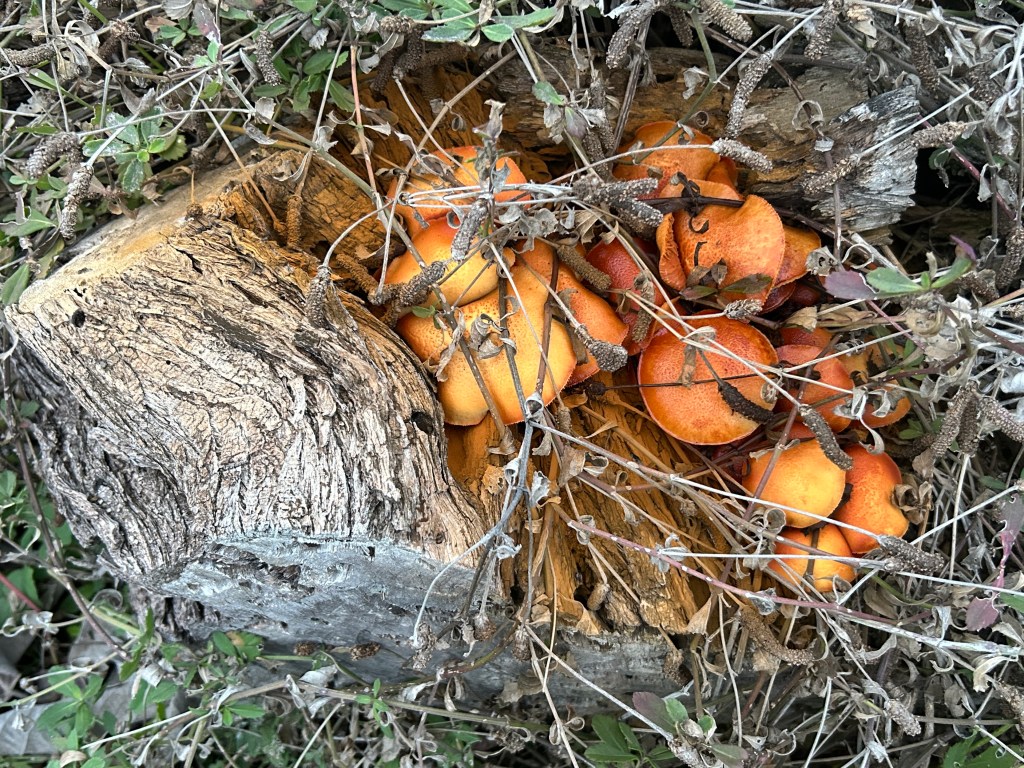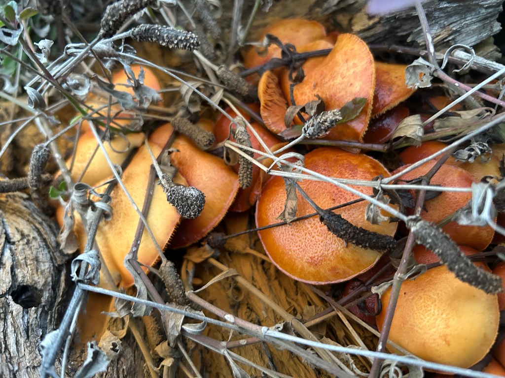 I think that these mushrooms are Scaly Rustgill (Gymnopilus sapineus), or if not exactly that, then something closely related. This mushroom generally grows on rotting wood, preferring conifers (although as it happens, most of the logs on my pile are actually mesquite). For anyone interested, there are photos of the wood pile when it was first created in July 2023 in this old post. It has collapsed a fair bit since then.