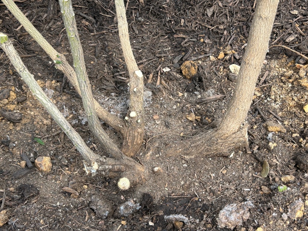 After trimming off branches and scraping soil away from the base of the tree, I added more mulch near but not touching the trunks. Now that I can see this area more clearly, it will be easier to move the soil back if needed.