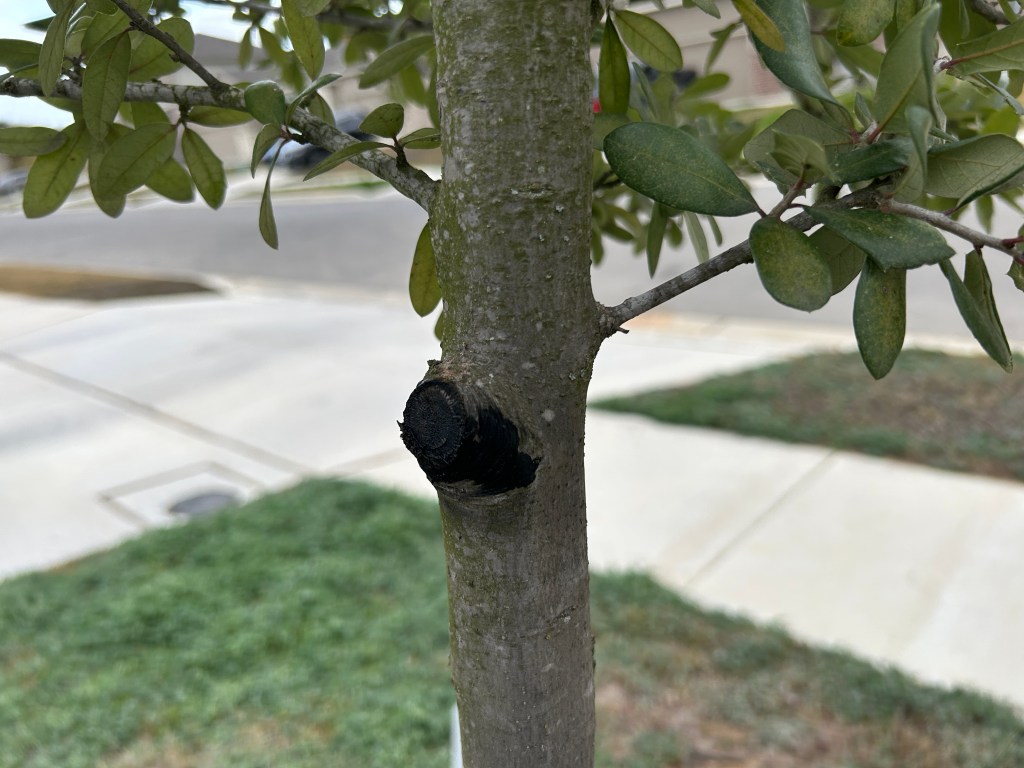 And here is the wound after pruning and painting. I use ordinary matte black spray paint — it is not necessary to buy special pruning paint.