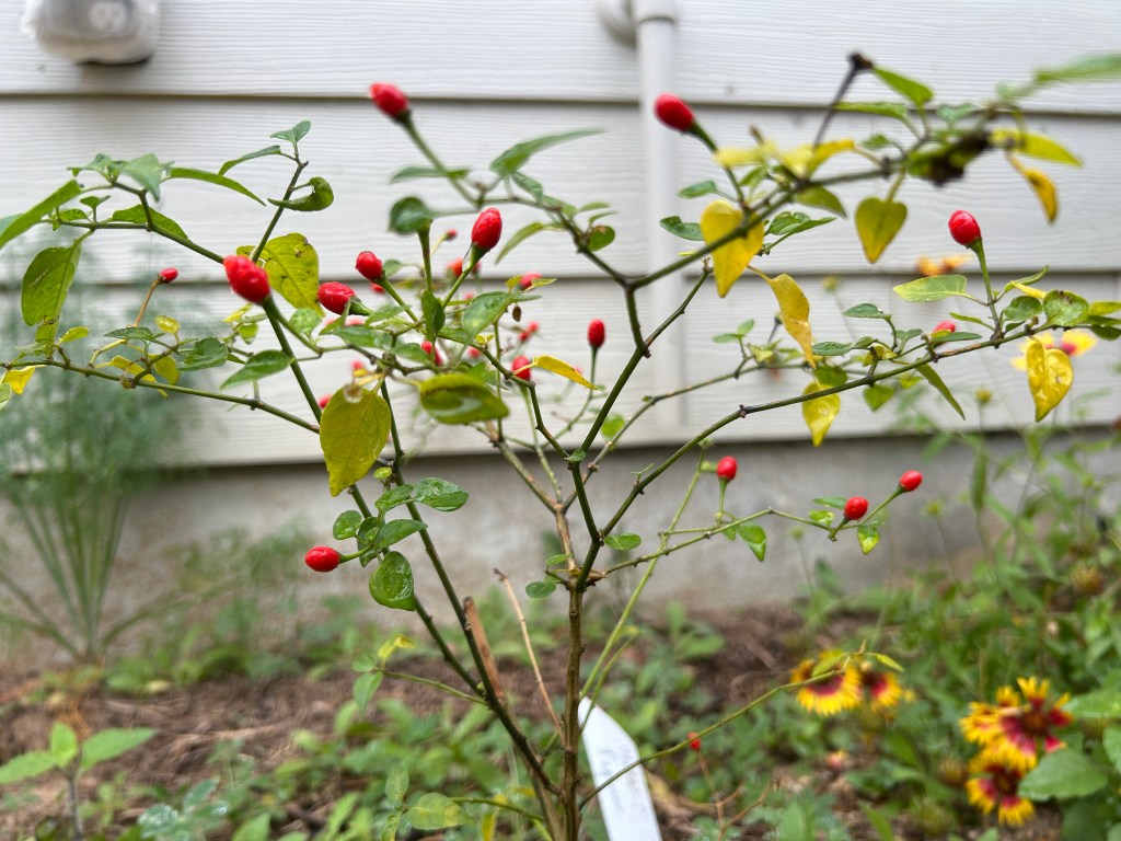In contrast, when I made a shade bed on the north side of the house last fall and planted a Chile Pequin there in October, it thrived. It has already grown bigger and produced an impressive harvest of peppers for its first year. This also fits what I have observed in a local forest, where Chile Pequins happily grow and seed themselves in the shaded understory habitat.