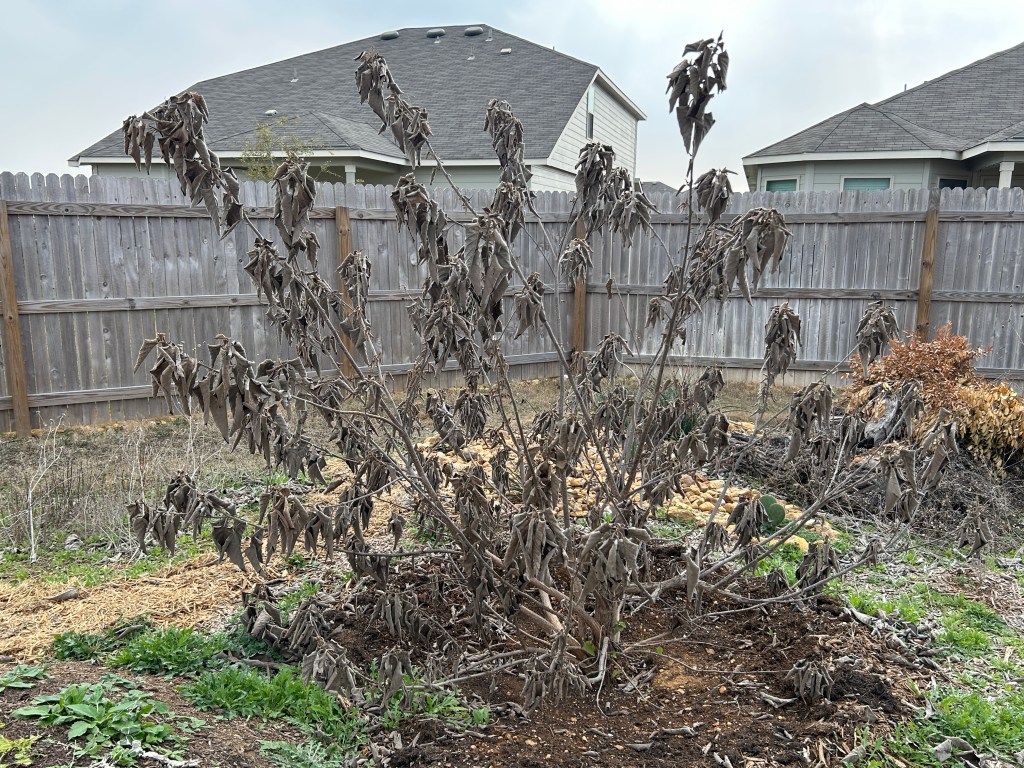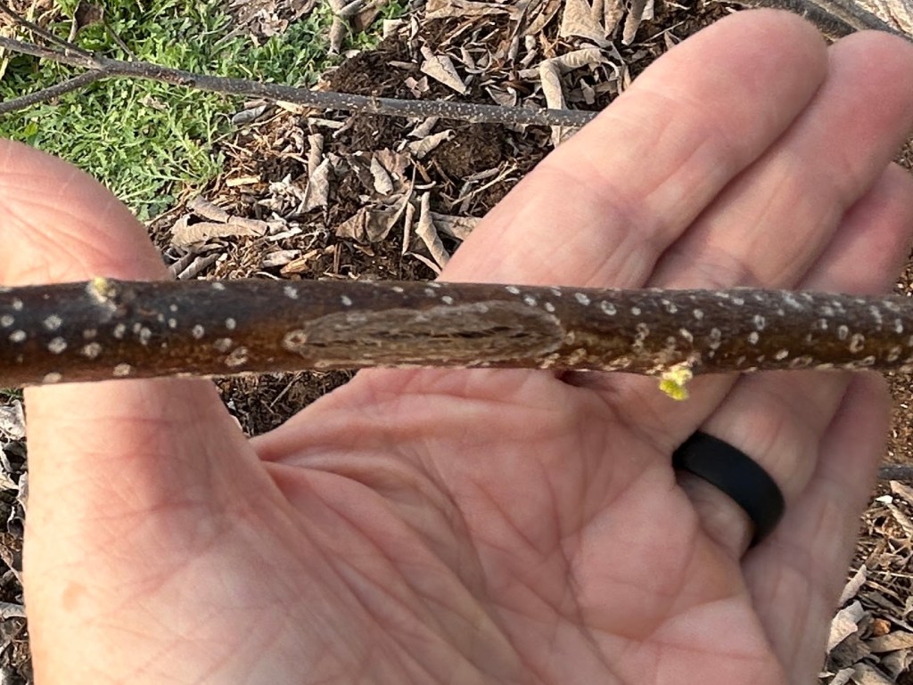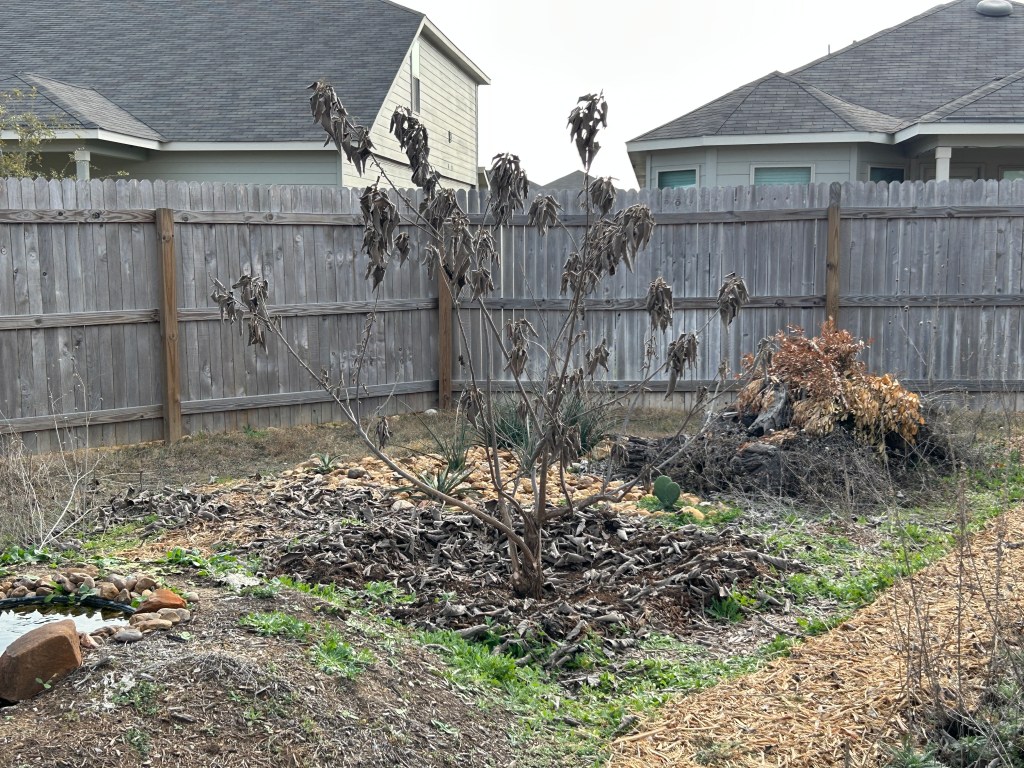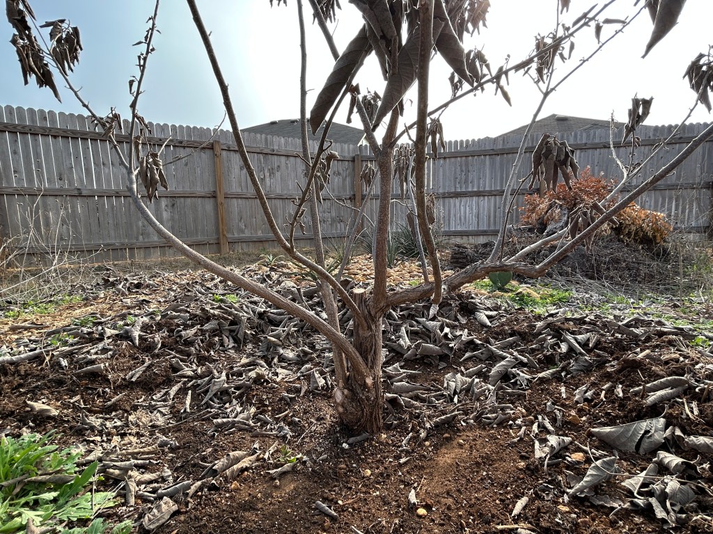 Although we could technically get another freeze this year, I decided to proceed with pruning because I don’t want the tree to waste energy growing leaves on branches that will be removed. If we do get another freeze in March, I will protect the lower trunk with mulch as I did in January.