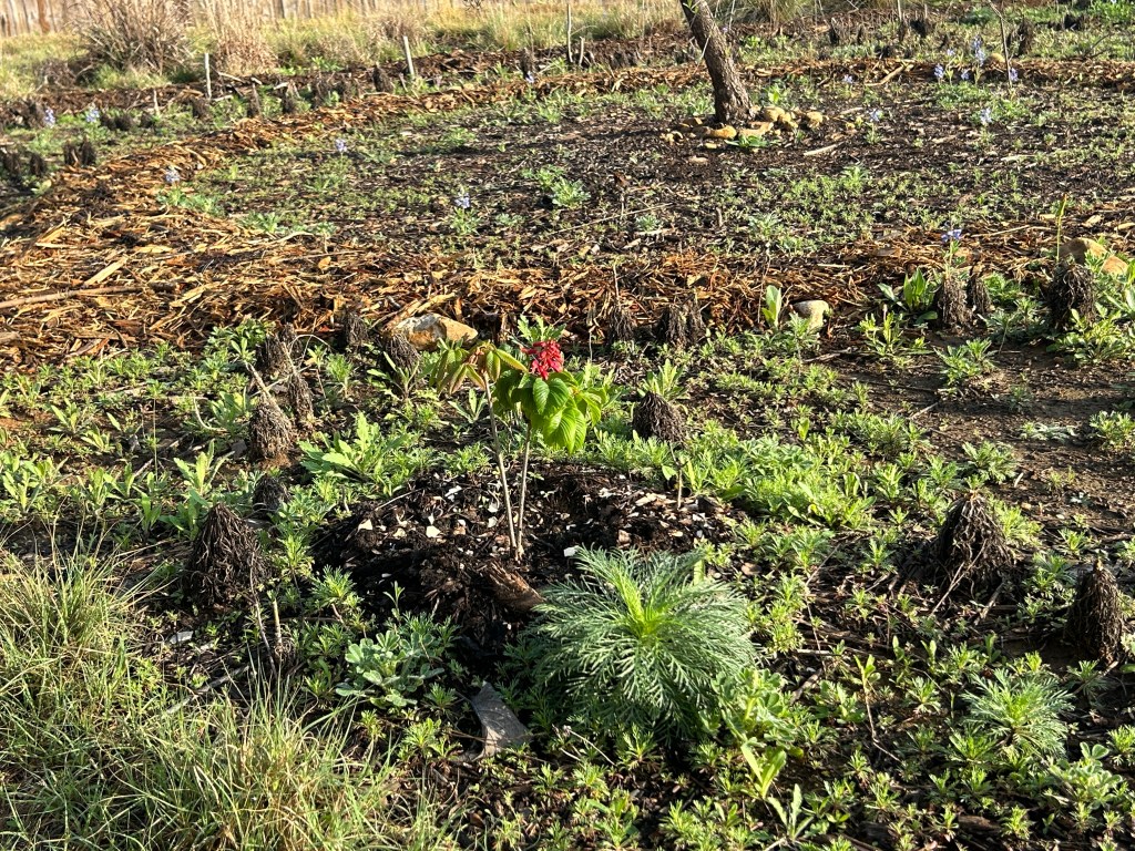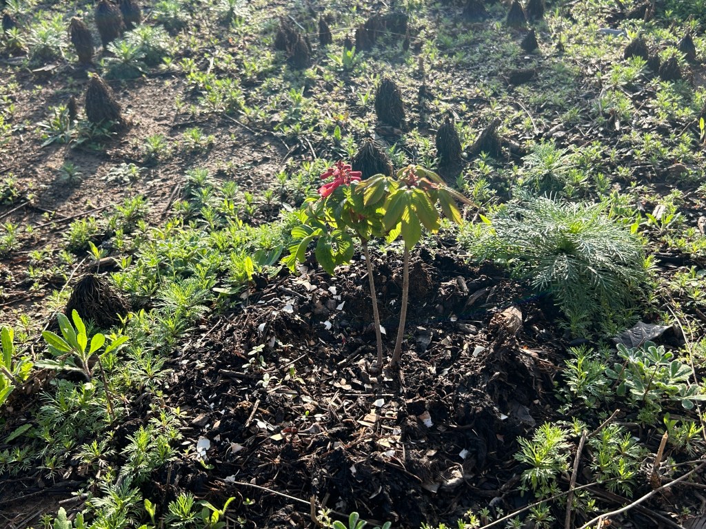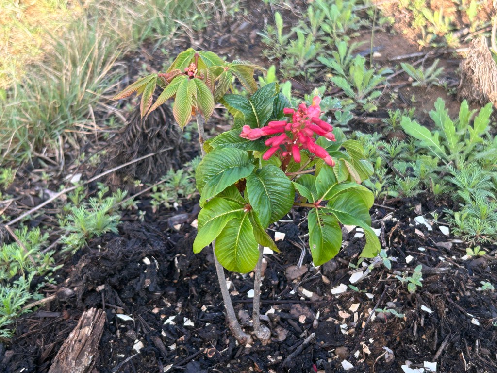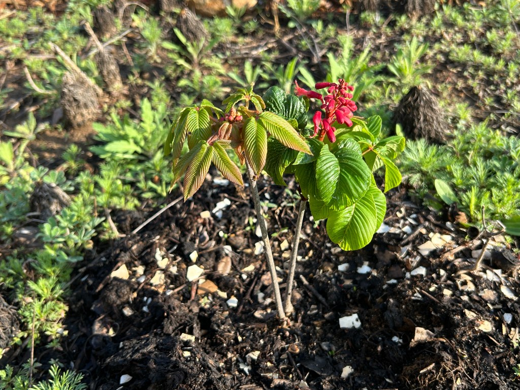 Red Buckeye (Aesculus pavia) is a small tree that I planted in 2024. It seemed to be settling in, but then failed to grow new leaves the next spring. I thought it was dead, but a few weeks later it started new growth from the ground and by the end of its season it was almost the same size as when I bought it (11 inches vs. 14 inches).