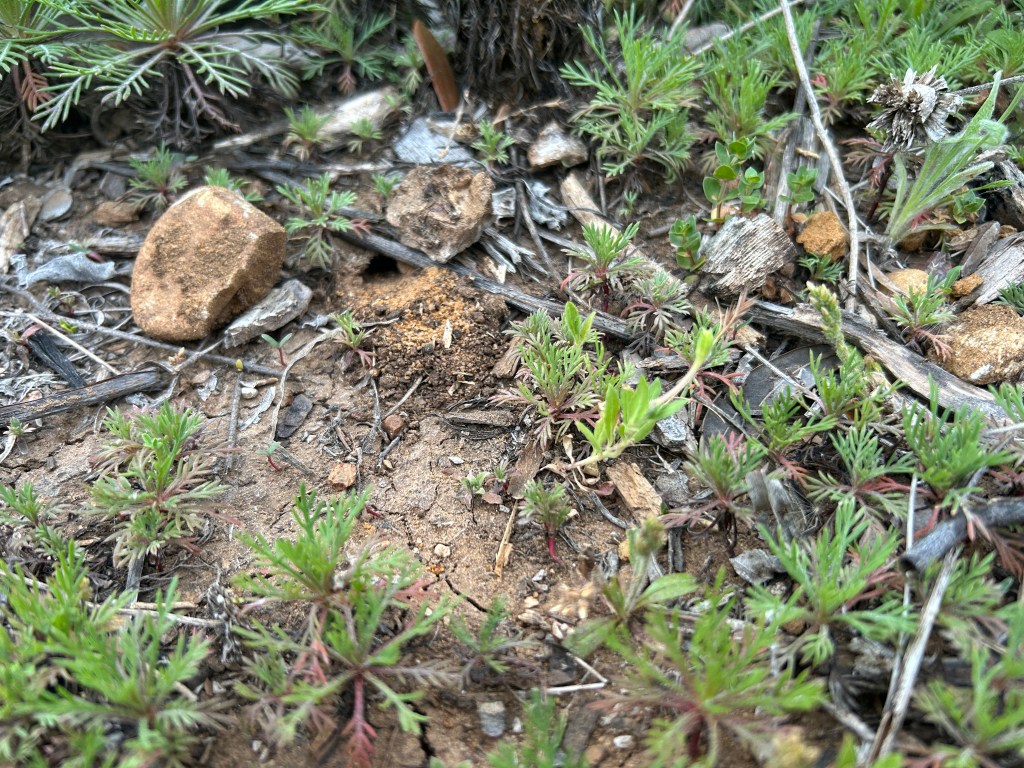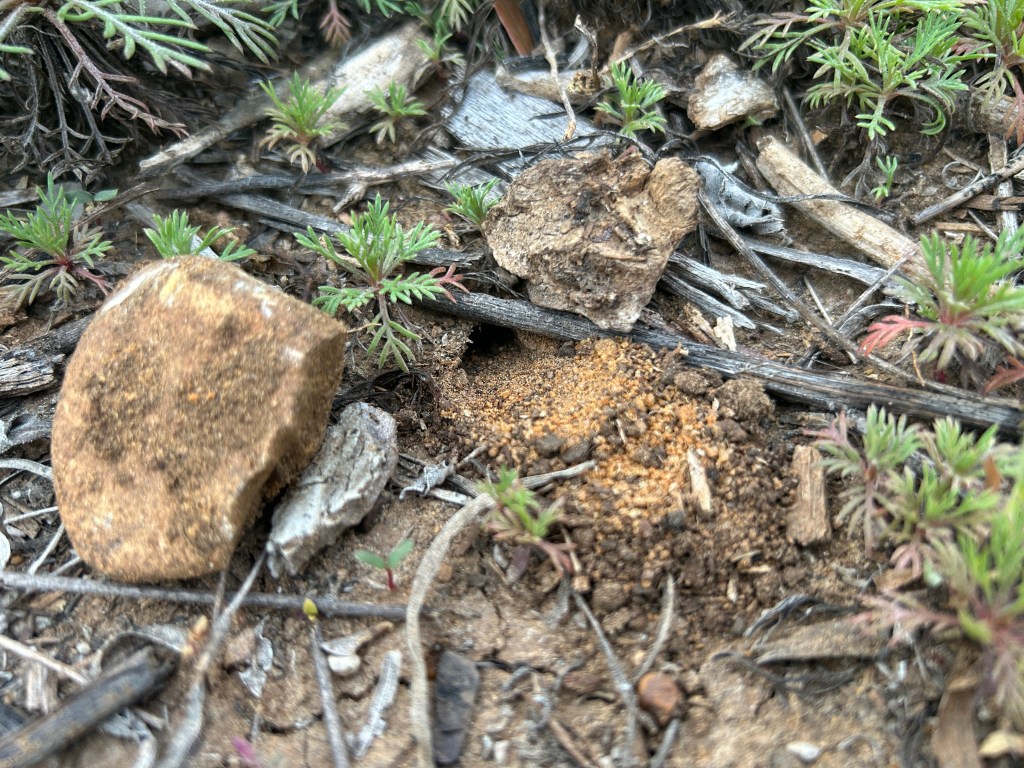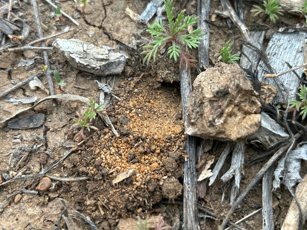 This Texas Parks & Wildlife page says that, “The majority of solitary bees are ground-nesters that excavate burrows in well-drained, sunny patches of bare-ground.” That is exactly the situation in the area of my garden where I saw the bee. I don’t know what kind mine is, but in case I might see her again, I put a small stone next to the burrow entrance (on the left) so that I can easily find it again. I hope that doesn’t confuse her.