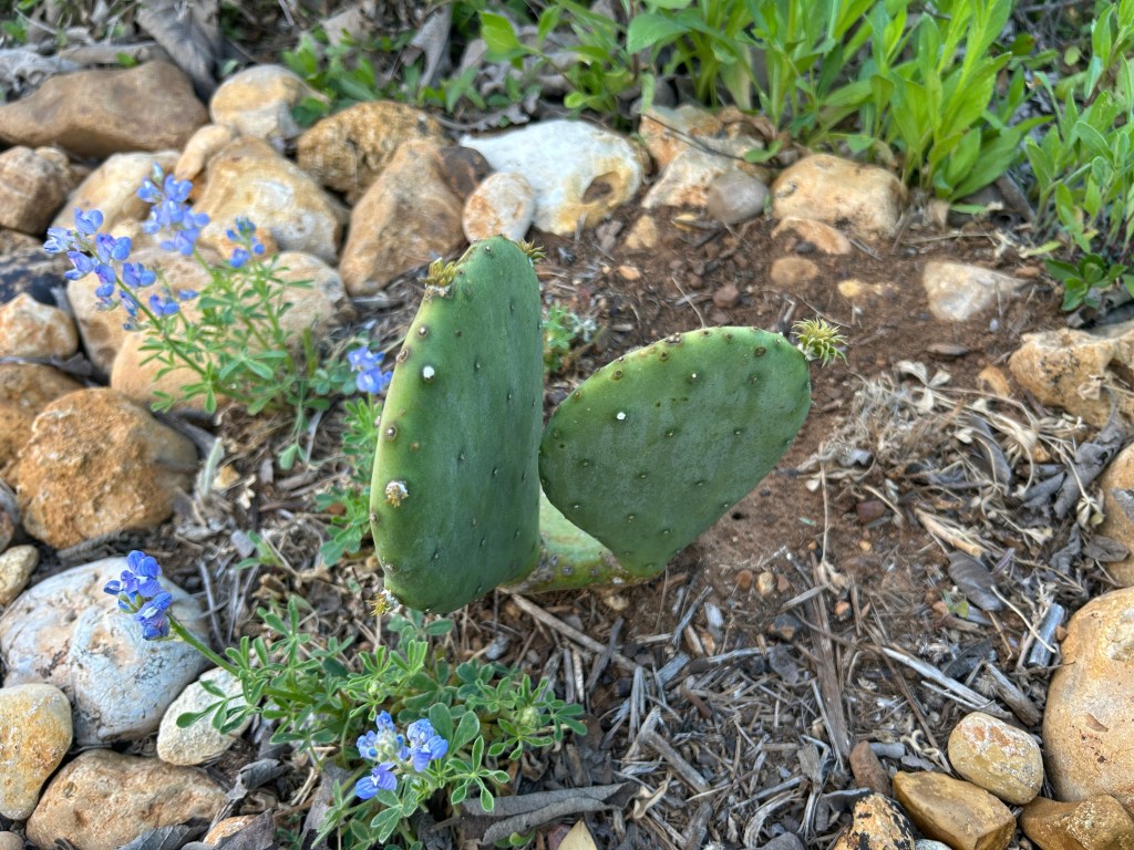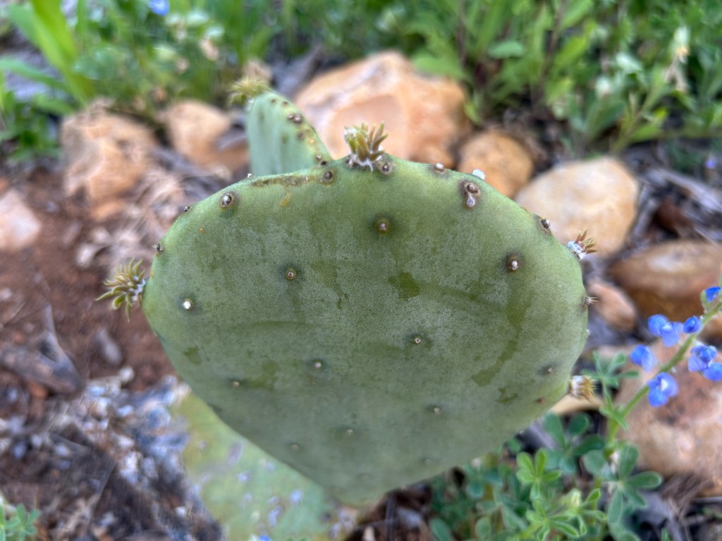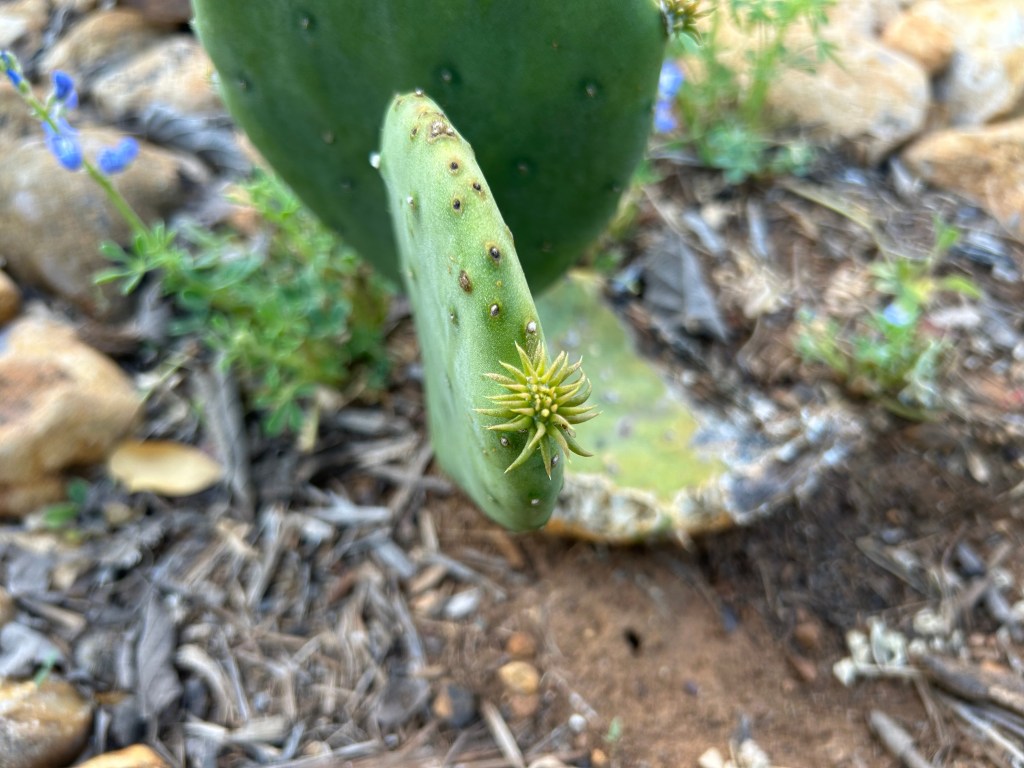 I have a Spineless Prickly Pear (Opuntia ellisiana) cactus that was planted last year. It’s still small, just one horizonal pad on the ground and two vertical pads that have grown from it.