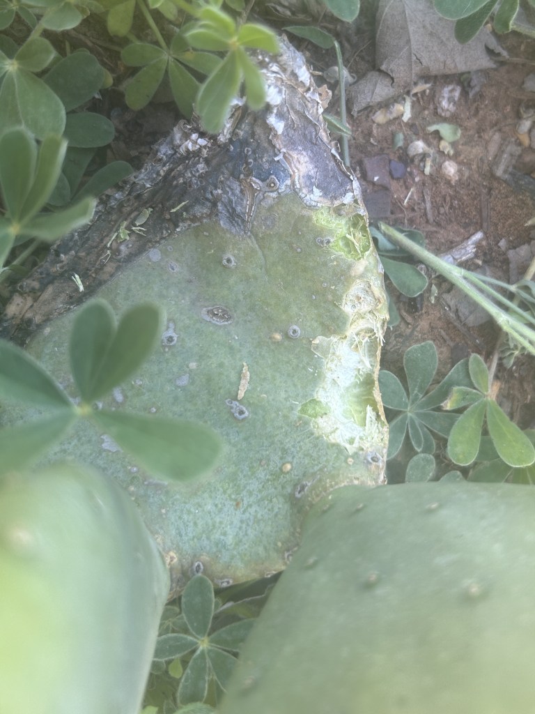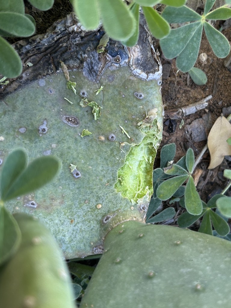 I thought the most likely reason for eating prickly pear would be to get moisture. However, just feet away is a pond. So whatever it was didn’t want to, or couldn’t, drink from the pond. That also might suggest something small since the pond doesn’t have good shallow entry points (yet).