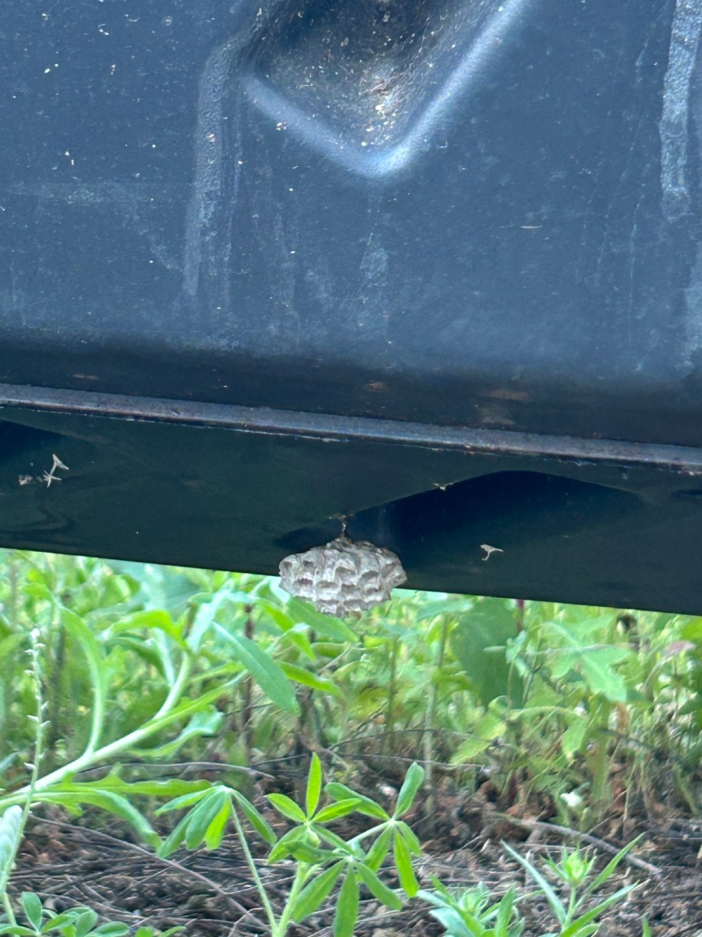 The underside of my tumbling composter is NOT a good place for a wasp nest! So I was prepared to kill the nest and its occupants later in the evening (dusk is when they tend to be back at the nest and calmest), but when I looked at that time there were no adults present. It was the same the next day, so I think I must have startled them enough to abandon the nest. At that point I just cut the nest down and crushed it. There were some eggs in the cells.