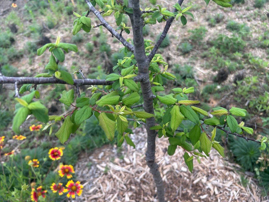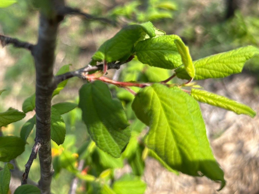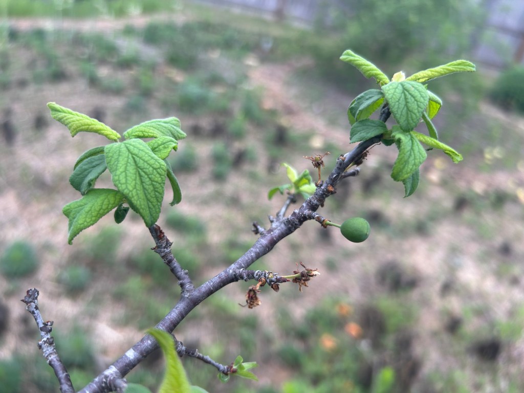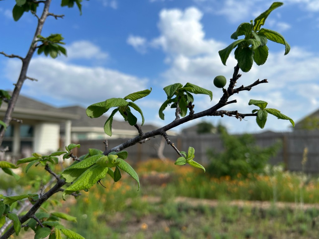 The Mexican Plum (Prunus mexicana) tree was planted in 2023. The following year there were leaves but no blooms. Last year there were leaves and blooms, but no fruit. This year, in addition to leaves and blooms, I think there may be one fruit developing!