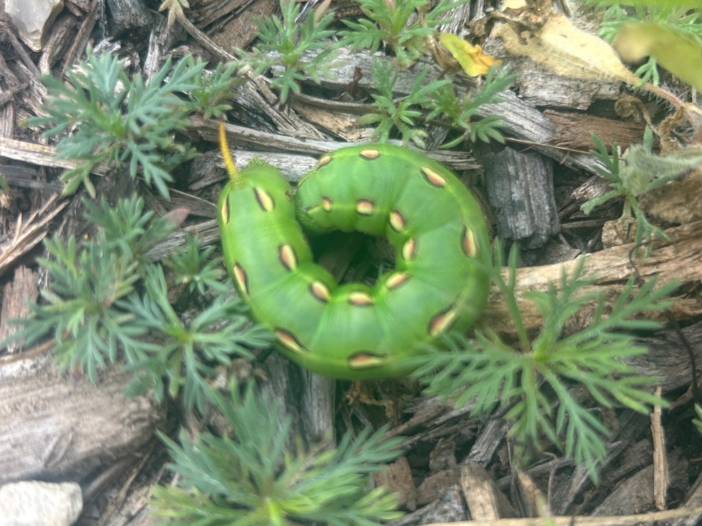 While thinning some plants in an area, I came across this chunky beauty. It’s a caterpillar of the White-Lined Sphinx (Hyles lineata), which is a large moth that I see here fairly often.